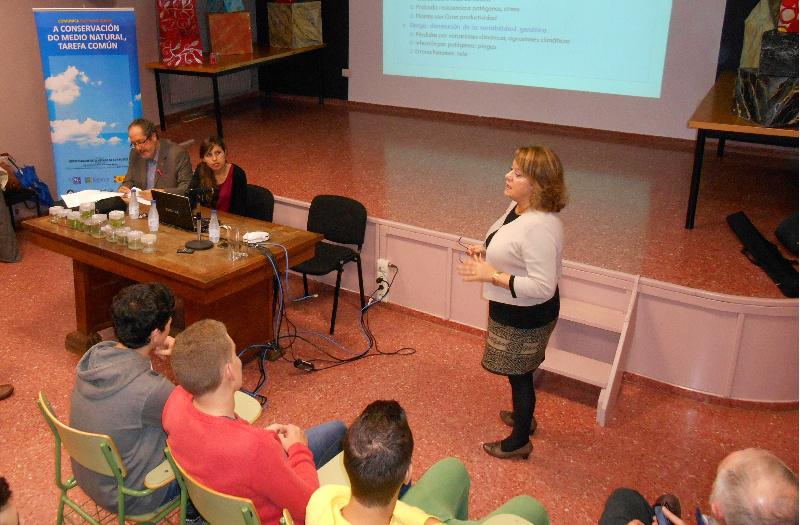 A decana da Facultade de Bioloxía sinalou tamén que “unha das principais aplicacións da biotecnoloxía é a conservación da flora ameazada”, a composta por aquelas especies nas que hai un número moi baixo de individuos na natureza, cando o seu hábitat está moi deteriorado ou cando teñen grandes dificultades para reproducirse, sendo ademais difícil conseguir a súa conservación por outros medios, explicou. Nestes casos, “cos métodos e técnicas da biotecnoloxía, a partir de calquera anaco de planta poderemos rexenerar individuos completos e conservalos”, engadiu a profesora. González Caamaño e Anali Lizárraga Farfán, investigadora de doutoramento no departamento de Fisioloxía Vexetal da USC, abordaron este mércores en Padrón a temática da biotecnoloxía aplicada á conservación das plantas ameazadas nunha dobre sesión desenvolvida ao abeiro das xornadas de divulgación científica ‘A conservación do medio natural, tarefa común’ , organizadas pola Universidade de Santiago de Compostela en colaboración con Turismo de Galicia, a través do programa do VIII Centenario da peregrinación de San Francisco a Compostela. O subdirector de El Correo Gallego José Antonio Pérez Docampo foi o encargado de moderar as dúas sesións. A xornada desenvolvida en quenda de mañá celebrouse no IES Macías o Namorado e estivo orientada a docentes e estudantes deste centro de ensino e tamén do IES Camilo José Cela. Xa en quenda de tarde, o Auditorio da Fundación Pública Galega Camilo José Cela converteuse en sede dunha sesión aberta ao público e de asistencia gratuíta. As técnicas de biotecnoloxía aplicada á conservación das plantas constitúen “unha ferramenta indispensable para a conservación das especies ameazadas que poden ser vulnerables ou que están en perigo de extinción”, indicaron as investigadoras da USC en Padrón, onde lembraron que en Europa existen na actualidade más de 20.000 taxóns de plantas vasculares. A Lista Vermella Europea de Plantas Vasculares inclúe 1.826 especies, das que 467 foron clasificadas como ameazadas de extinción. Ademais, no Libro vermello da flora ameazada e endémica de Galicia de 2012, aparecen 153 plantas ameazadas e delas, 58 en perigo crítico de extinción. Por provincias, repártense do seguinte xeito: 25 na Coruña, 13 en Lugo, 11 en Pontevedra e 9 en Ourense. Métodos para a conservación ex situ González Caamaño e Lizárraga Farfán deixaron constancia de que a conservación e almacenamento ex situ mediante biotecnoloxía para poder salvar estas plantas emprega tres métodos. O primeiro é a conservación mediante cultivos in vitro con crecemento mínimo, en condicións controladas de nutrientes, fitohormonas, luz e temperatura. Un segundo, é a encapsulación nunha matriz de alxinato chegando a conseguir sementes artificiais, técnica moi útil cando se busca unha conservación a medio prazo. As investigadoras sinalaron en último lugar a crioconservación, un proceso que consiste nun conxunto de técnicas que permiten preservar o xermoplasma das plantas, por longo períodos de tempo, a temperaturas moi baixas, de ata -196ºC, conseguindo a paralización completa do metabolismo celular mediante a súa inmersión en nitróxeno líquido. A cita de Padrón é a sétima que se celebra dentro das xornadas divulgativas A conservación do medio natural, tarefa común, organizadas pola Universidade de Santiago de Compostela e patrocinadas por Turismo de Galicia, a través do programa do VIII Centenario da peregrinación de San Francisco a Compostela, que se están a celebrar en 20 concellos vinculados ó Camiño de Santiago. A próxima cita será na Fonsagrada, o vindeiro venres 17 de outubro, e versará sobre a vaca.