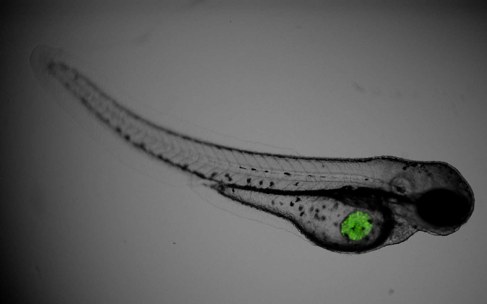 Exemplar de peixe cebra ao que se inxectaron células con melanoma mutado por BRAF que contiñan xa o composto velenoso do polbo