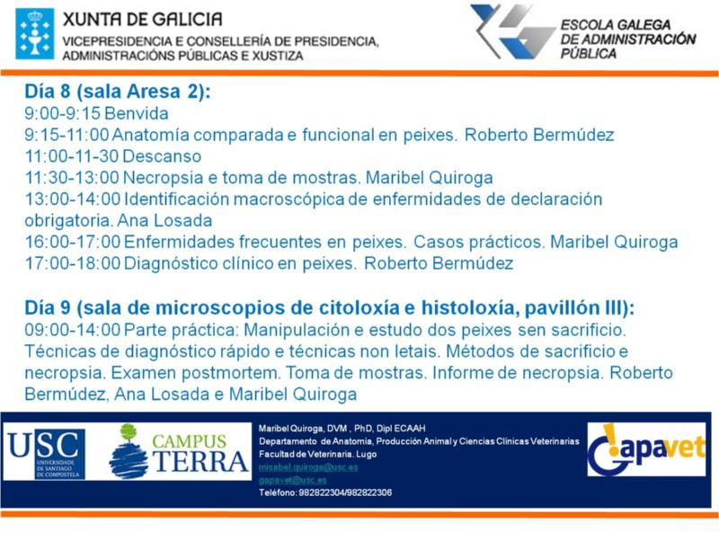 Estas acción formativas permitirán tamén facer unha descrición das principais técnicas de diagnóstico rápido, ao tempo que se constatará a importancia da necropsia como ferramenta acaída para diagnosticar posibles enfermidades en peixes. O programa teórico deste curso, que está estruturado en 12 horas e formación e conta con financiamento da Escola Galega de Administración Pública (Egap) da Xunta de Galicia, permitirá asemade afondar nas características morfolóxicas dalgunhas enfermidades.