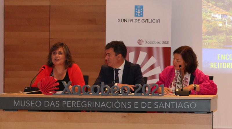 A secretaria executiva do Grupo Compostela de Universidades, María Teresa Carballeira, e o conselleiro de Cultura e Turismo, Román Rodríguez, asinaron este mércores un convenio de colaboración para a organización do Encontro Internacional de Reitores no Camiño de Santiago nun acto conducido pola Comisaria do Xacobeo 2021, Cecilia Pereira.