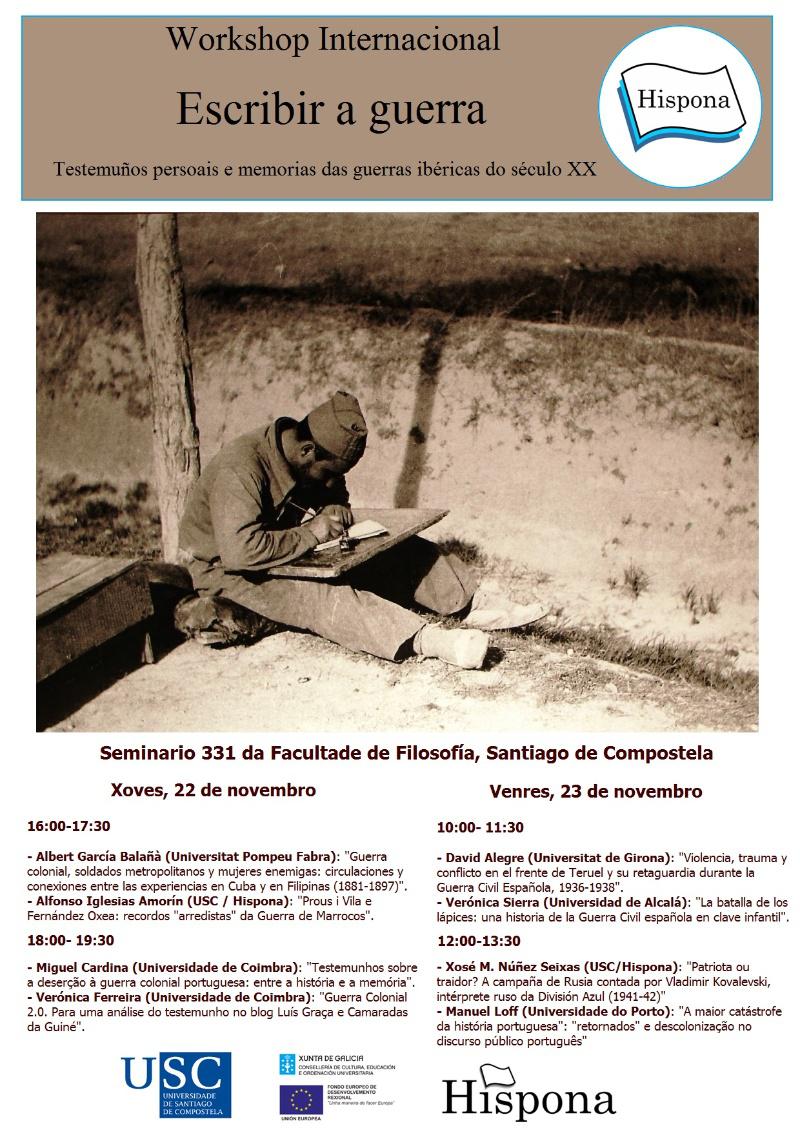 O grupo HISPONA (Historia política e dos nacionalismos) da USC organiza o encontro ‘Escribir a guerra. Testemuños persoais e memorias das guerras ibéricas do século XX’. Coordinado polos investigadores Xosé M. Núñez Seixas e Alfonso Iglesias Amorín, terá lugar os días 22 e 23 de novembro no seminario 331 da Facultade de Filosofía.