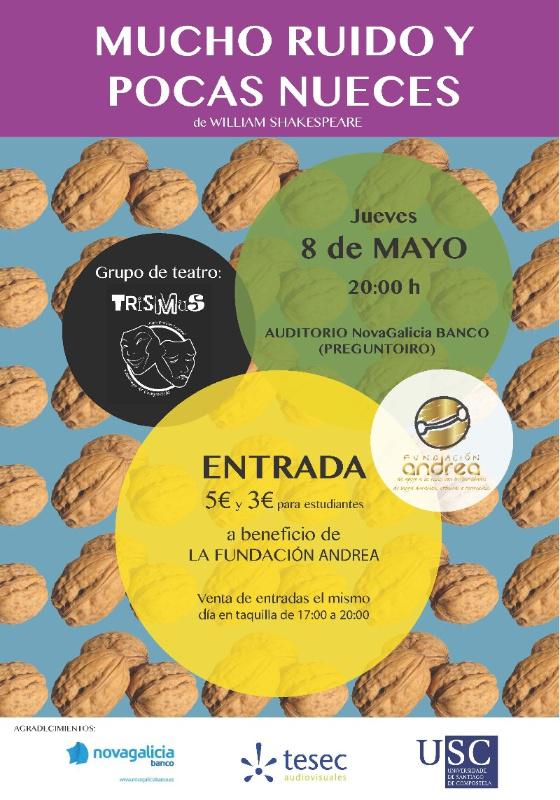 A asociación de estudantes TRIsMuS da Facultade de Medicina da USC representa este xoves 8, ás 20.00 horas no Auditorio Novagalicia Banco, a obra de teatro ‘Mucho ruido y pocas nueces’ de William Shakespeare. Como cada ano, a asociación organiza esta actividade cun obxectivo benéfico e nesta ocasión o recadado destinarase á Fundación Andrea, que apoia aos cativos e cativas con enfermidades de longa duración, crónicas ou terminais. As persoas que desexen colaborar poden adquirir a súa entrada no auditorio ese mesmo día a partir das 17.00 horas ata xusto antes de que comece a función. O prezo das entradas e de cinco euros xeral e tres euros para estudantes. Os integrantes deste grupo de teatro son na súa maioría estudantes da USC, de distintas facultades, se ben a asociación naceu en Medicina en 1995. A estudante da Facultade de Ciencias Económicas e Empresariais Berta Cobo, é a actual directora que adaptou a obra de Shakespeare para os actores non profesionais. Dende hai dous anos, TRiSMUS colabora coa Fundación Andrea, pero ao longo da súa historia este grupo de teatro realizou quince representacións en diversas instalacións universitarias así como outras actividades como recitais de poesía ou performances improvisados, todos cun obxectivo benéfico e sen ánimo de lucro. TRiSMuS O grupo TRIsMUS ten como principais fins a aprendizaxe de técnicas de interpretación e a representación sen ánimo de lucro. Tódolos anos imparten un curso que serve para captar novos actores e aos que amosan técnicas de improvisación, proxección vocal, expresión corporal e outras nocións básicas que poñen en práctica na representación anual coa que recadan fondos para diversos fins benéficos.