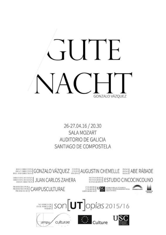 A próxima cita do festival son[UT]opías 2015/2016 será o espectáculo Gute Nacht que produce campUSCulturae segundo a idea e concepción artística do poeta, deseñador e performer Gonzalo Vázquez. Esta proposta escénica que mestura canto lírico, piano e danza contemporánea presentarase ao público este martes 26 ás 20.30 na Sala Mozart do Auditorio de Galicia, onde se desenvolverá tamén a segunda parte do espectáculo o mércores 27.