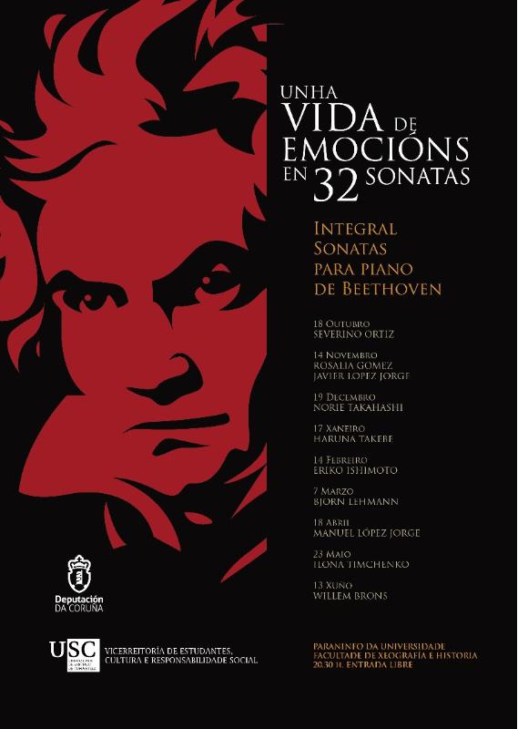 As 32 sonatas para piano que Beethoven compuxo ao longo da súa vida volven soar no Paraninfo da Universidade nun novo ciclo organizado pola USC en colaboración coa Deputación da Coruña. Son un total de nove concertos, un por cada mes do curso académico, todos ás 20.30 horas, e coma sempre de entrada libre ata completar o aforo. En febreiro será a pianista Eriko Ishimoto quen toma o relevo. O ciclo complétase coas actuacións de Björn Lehmann, Manuel López Jorge, Ilona Timchenko e Willem Brons nos seguintes meses ata xuño.