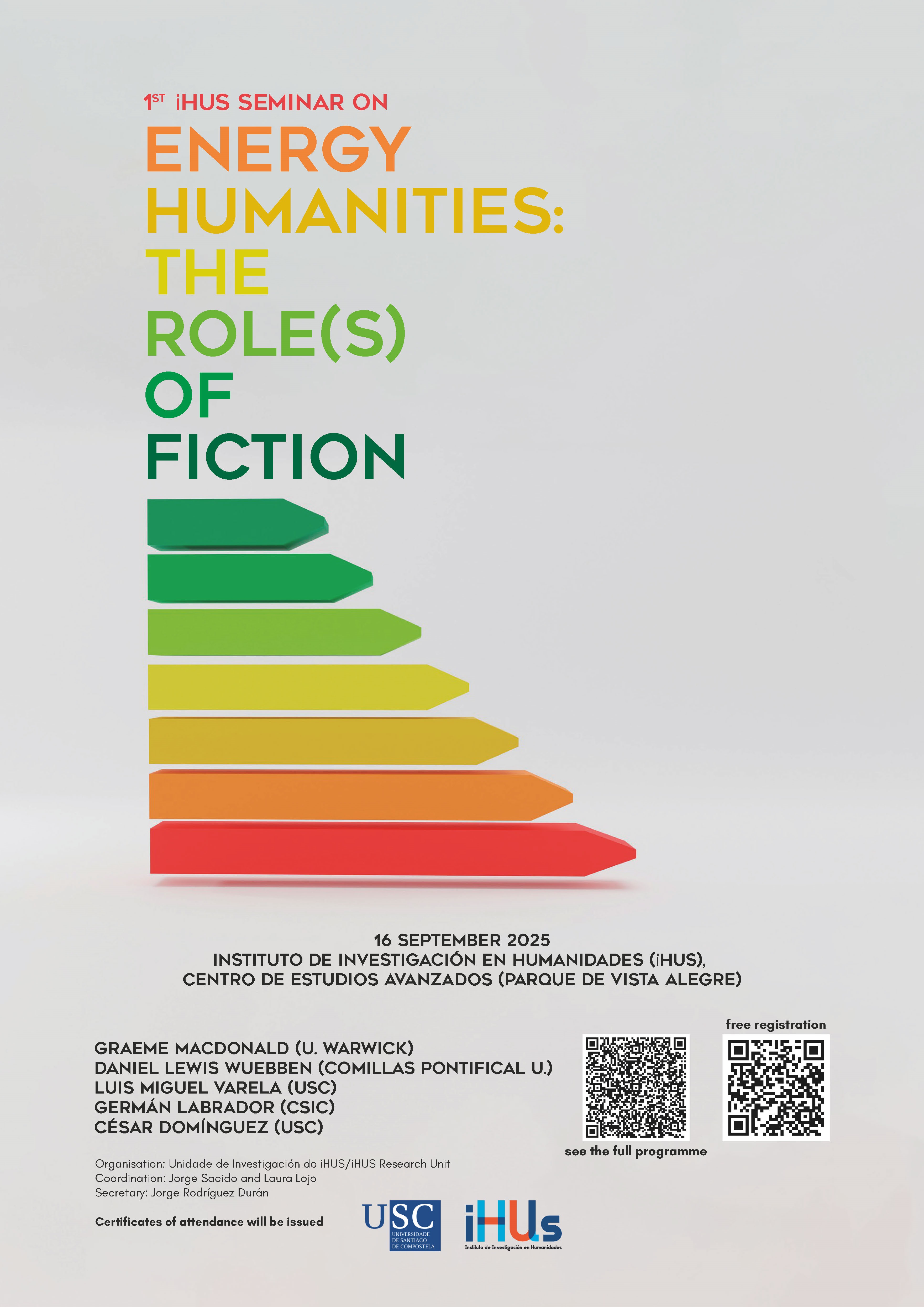 O evento pon o foco nas Humanidades Enerxéticas, un campo de estudo emerxente que trata de investigar “o noso modelo cultural, social e vital en relación co consumo enerxético, así como os futuros desafíos e o noso xeito de enfrontarnos a eles a través das artes”, explican dende a organización do foro. Todas aquelas persoas que asistan a un mínimo do 80% das horas terán dereito a recibir un certificado de asistencia. Ante calquera dúbida, pódese contactar con Jorge Rodríguez (jorge.rodriguez.duran [at] usc.es (jorge[dot]rodriguez[dot]duran[at]usc[dot]es)) ou con Jorge Sacido (jorge.sacido [at] usc.es (jorge[dot]sacido[at]usc[dot]es)).