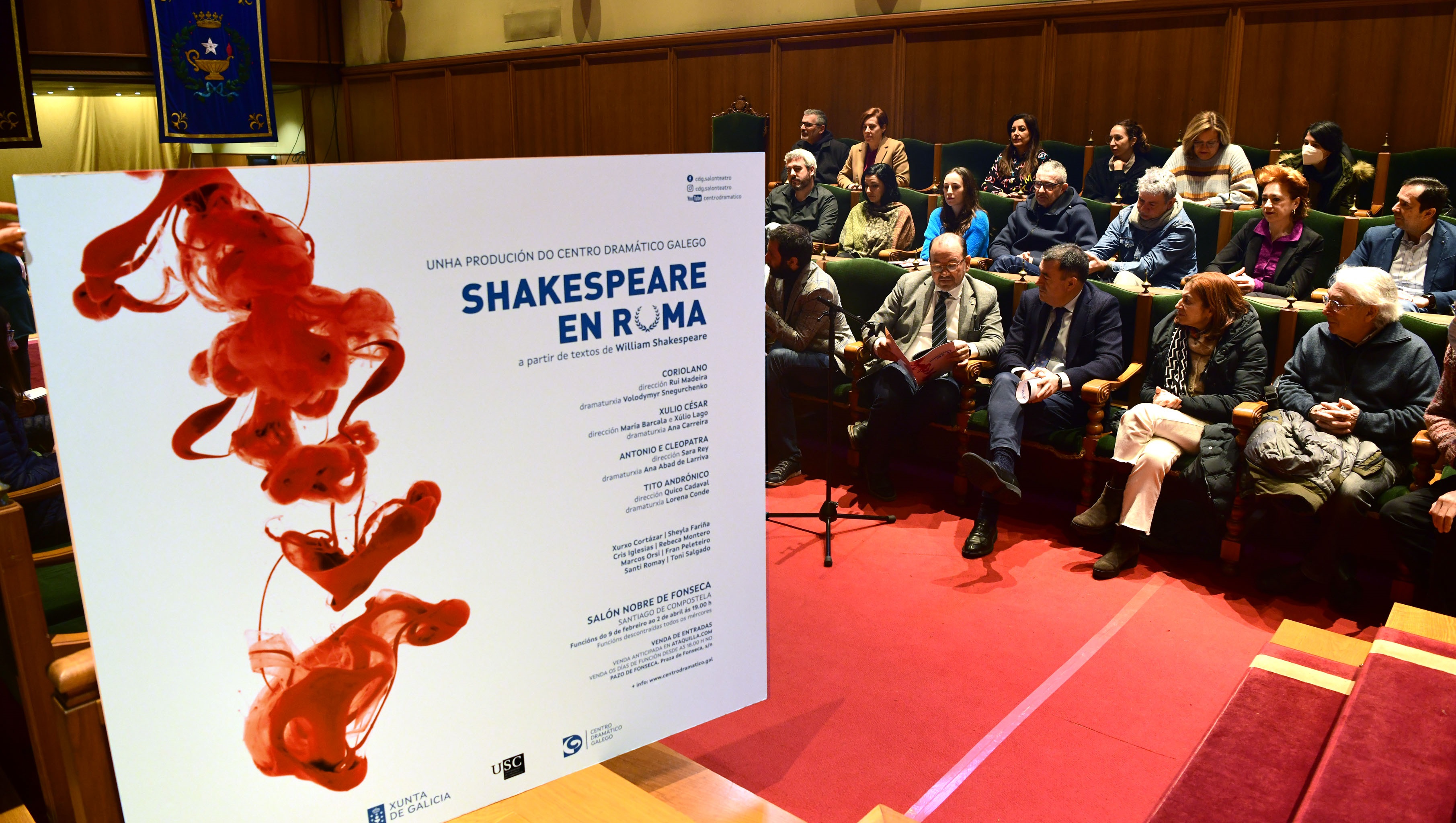 O Salón Nobre do Colexio de Fonseca converterase a partir do vindeiro 9 de febreiro en escenario teatral ao acoller a estrea de Shakespeare en Roma, a última produción do Centro Dramático Galego (CDG). O reitor da USC, Antonio López, e o conselleiro de Cultura, Educación, Formación Profesional e Universidades, Román Rodríguez, presentaron este martes 7 os detalles desta representación cuxos ensaios tamén se desenvolveron no Colexio de Fonseca ao longo dos últimos meses.