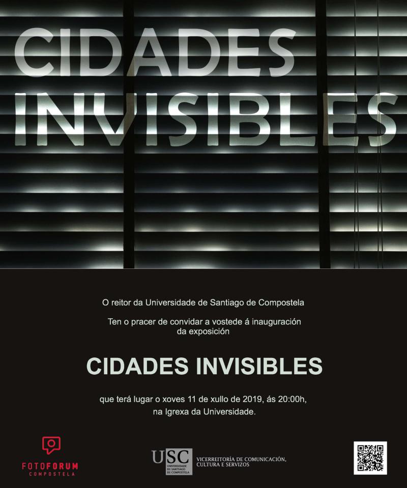 A Igrexa da Universidade acollerá a partir deste xoves 11 a mostra ‘Cidades invisibles’, proxecto expositivo da Asociación Cultural Fotoforum Compostela que ten como referente o libro de Italo Calvino As Cidades Invisibles. A vicerreitora de Comunicación, Cultura e Servizos, Mar Lorenzo Moledo, e o fotógrafo e comisario da mostra, Fucos Reyes, inaugurarán a mostra nun acto a partir das 20.00 horas.