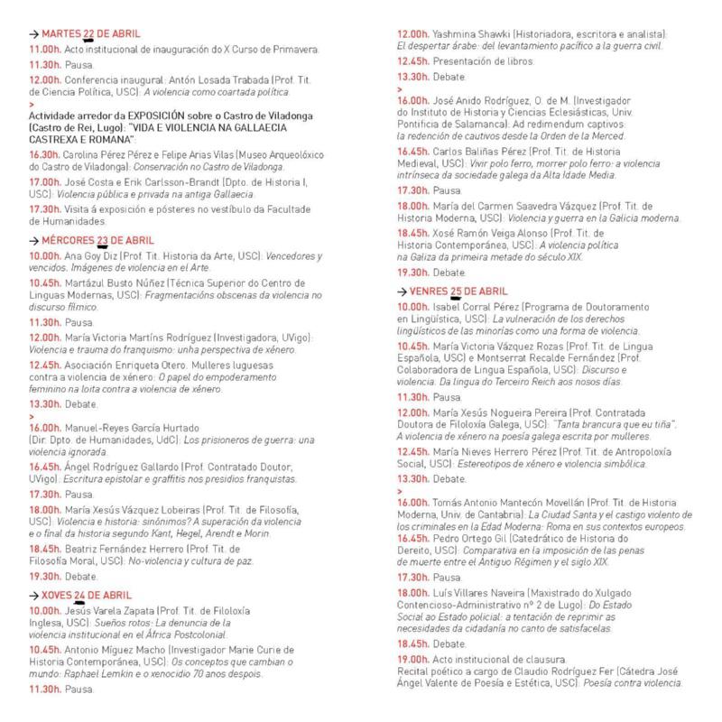Máis de 70 persoas formalizaron a súa inscrición na décima edición do Curso de Primavera da USC, un foro de análise e debate organizado ao abeiro do convenio Lugo Cultural e orientado a complementar a formación humanística do estudantado universitario do campus lugués, así como do resto da sociedade, que se desenvolverá do 22 ao 25 de abril no salón de actos da Facultade de Humanidades de Lugo, onde se celebrarán diversos relatorios e táboas redondas, cuxas temáticas afondarán no estudo e na análise da da violencia na cultura e na historia.