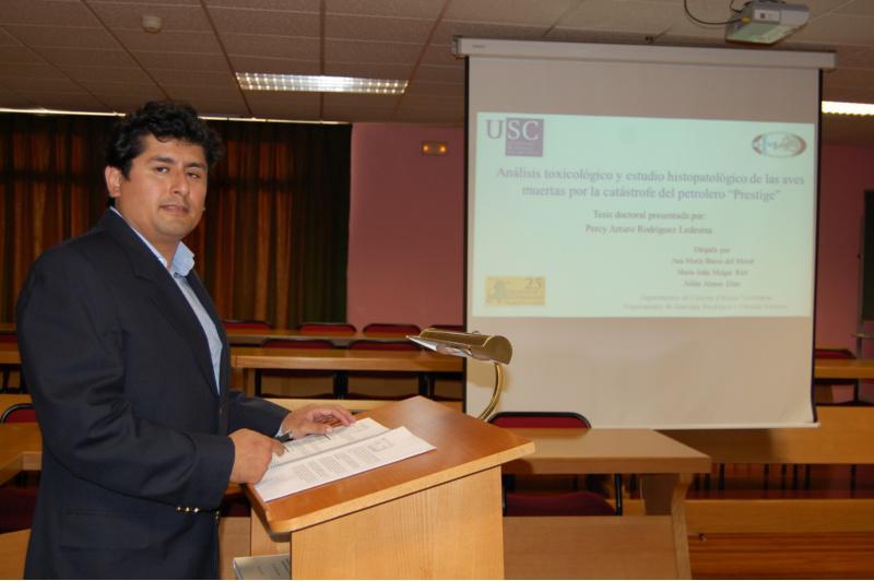 As elevadas concentracións de materiais como mercurio, chumbo ou cadmio deparadas nos resultados das análises practicadas ás aves mortas obxecto de estudo nesta investigación, figuran tamén entre as conclusións achegadas por Percy Arturo Rodríguez, quen subliña esta realidade logo de comprobar que os resultados cuantitativos sobre a presenza destes elementos nas augas mariñas afectadas polo ‘Prestige’ revelan un grao de concentración superior ao advertido noutros estudos. Outro dos riscos sinalados por este investigador respecto da presenza destes elementos nesta zona do litoral galego atinxe ao seu carácter acumulativo, xa que todo apunta a acción do home como axente causante da chegada e posterior concentración de chumbo, cadmio e mercurio, entre outros elementos, cuxos efectos contaminantes son claros. Unha realidade parella á advertida por este investigador na área da costa galega da que procedían ou na que se atoparon ás aves mariñas mortas logo da inxestión de fuel vertido polo Prestige, tamén se aprecia nalgunhas zonas do Delta do Ebro, nas que tamén está constatada a elevada concentración destes elementos. Estudo patalóxico e toxicolóxico de aves A investigación que deu pé a tese de doutoramento de Percy Arturo Rodríguez e que leva por título 'Análise toxicolóxica e estudo histopatolóxico das aves mortas pola catástrofe do petroleiro 'Prestige', aborda o estudo da anatomía patolóxica das aves mortas e tamén a análise toxicolóxica dos seus órganos, para logo relacionar os distintos datos obtidos. Este minucioso proceso de estudo repetiuse cos 427 exemplares da seis especies de aves mariñas obxecto deste traballo: alcas, araos e frailecillos, que son aves mergulladoras da familia dos álcidos, gaivotas, cormoranes e alcatraces. O laborioso traballo de investigación feito por Percy Arturo Rodríguez e posteriormente recollido nunha tese de doutoramento, dirixida polos profesores da Facultade de Veterinaria do campus de Lugo Ana Bravo del Moral, Julia Melgar Riol e Julián Alonso, e que mereceu a máxima cualificación de sobresaínte cum laude, permite non só estudar o impacto producido polos derrames de hidrocarburo, senón que tamén axuda a determinar a calidade da contorna na que habitan as especies analizadas. Entre os achados máis novos deste estudo pioneiro e multidisciplinar cómpre subliñar que o feito de que moitas aves non petroleadas inxeriran fuel desmonta a crenza de que estas aves comían o cru para limpar a súa plumaxe, ao tempo que apunta á mortalidade dun número de exemplares moito maior que o das aves impregnadas directamente polo chapapote. As necroses hepática e renal practicadas exclusivamente en aves con fuel no tubo dixestivo confirma que ambos órganos son diana dos efectos tóxicos derivados da inxesta de fuel. Doutra banda, a identificación de nematodos Contracaecum rudolphii nalgúns álcidos e a ausencia de lesións severas relacionadas, indican que podería existir unha relación parásito hospedador incluso beneficiosa para as aves. Este traballo tamén posibilitou o estudo de doce elementos inorgánicos achados no fuel, que, aínda que presentaba niveis de vanadio moi elevados, a súa posterior concentración nas aves foi comparativamente inferior, posiblemente debido ás dificultades para a súa absorción por vía oral. A incidencia destes elementos químicos, salvo no caso do cromo, varía nas distintas especies, quizá por mor das diferenzas do seu comportamento etolóxico e alimentario. Así, os álcidos destacan por presentar altos niveis de arsénico e mercurio, mentres que as gaivotas amosan unha maior concentración de chumbo e vanadio. Os efectos da contaminación por fuel tamén muda en función dos sexos. Daquela, a concentración de cromo en araos é máis alta en machos que en femias, mentres que en alcas, as concentracións de vanadio foron sexo dependentes en favor das femias. Percy Arturo Rodríguez, entre os profesores Ana Bravo, Julia Melgar e Julián Alonso, que dirixiron a investigación