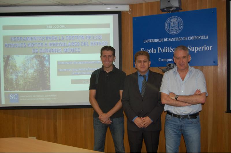 As investigacións desenvolvidas por Corral Rivas están recollidas na tese de doutoramento ‘ Ferramentas para a xestión dos bosques mixtos e irregulares do Estado de Durango’, dirixida polo catedrático da USC Juan Gabriel Álvarez e por Carlos Antonio López Sánchez, do Instituto de Silvicultura e Industria da Madeira de México, que vén de presentarse na Escola Politécnica Superior do campus de Lugo. Corral Rivas presenta na súa tese diversas ferramentas que se antollan acaídas para mellorar a xestión dos bosques mixtos e irregulares do Estado de Durango. Daquela, este investigador mexicano, que chegou ao campus de Lugo en 2010 a gravés dun programa de bolsas de investigación creado polo Banco Santander, desenvolve na súa investigación uns diagramas para o manexo da densidade do rodal (DMD), que permiten simular diversas alternativas de xestión ao longo da quenda. A caracterización e modelización das distintas distribucións de diámetros das árbores deste bosques, a través dun método que axusta altura e diámetro mediante modelos mixtos que inclúen parámetros específicos en cada sitio, constitúe outra das achegas feitas por este investigador mexicano na súa tese de doutoramento. Outra das contribucións plasmadas na teses de doutoramento de Corral Rivas estriba na construción dun modelo de crecemento en diámetro de árbore para as especies do xénero Pinus, que tamén emprega modelos mixtos con parámetros específicos de cada sitio. A utilidade dos resultados obtidos por este investigador mexicano é máxima para a mellora da xestión dos bosques da Serra Madre Occidental, unha rexión de alta heteroxeneidade ambiental, consecuencia da súa elevada diversidade fisiográfica e climática. De feito, esta rexión, que abrangue gran parte do estado de Durango, xera entre o 25% e o 30% da produción anual de madeira de todo México (1,5 millóns de metros cúbicos de madeira), ademais de ser unha importante fonte de servizos ambientais. O manexo forestal na rexión tense enfocado nas últimas tres décadas cara bosques irregulares para o aproveitamento das especies de madeiras de maior valor comercial, sobre todo do xénero Pinus. A xestión destes bosques semi naturais require ferramentas cuantitativas que permitan predicir o seu crecemento para, deste xeito, poder programar os tratamentos silvícolas axeitados, facer estimacións cuantitativas e cualitativas dos produtos a obter, optimizar o momento da corta... ademais de avaliar outros servizos do bosque, tales como os referidos á súa capacidade para capturar carbono e mitigar o efecto invernadoiro. Tribunal da tese e cualificación O catedrático de Silvicultura da Universidade de Göttingen, Klaus Von Gadow, actuou como presidente do tribunal encargado de cualificar a tese de doutoramento presentada na Escola Politécnica Superior da USC por Sacramento Corral Rivas baixo o título ‘Ferramentas para a xestión dos bosques mixtos e irregulares do Estado de Durango, México’, unha investigación co dirixida por Juan Gabriel Álvarez e Carlos Antonio López que mereceu a máxima cualificación de sobresaínte cum laude. O investigador en Silvicultura e Xestión dos Sistemas Forestais Gregorio Montero González, do Instituto Nacional de Investigación e Tecnoloxía Agraria e Alimentaria ; Andrea Hevia Cabal, do Centro Tecnolóxico e Forestal da Madeira, e Esteban Gómez García, do Centro de Investigación Forestal de Lourizán, tamén formaron parte deste tribunal de tese, do que actuou como secretario Roque Rodríguez Soalleiro, catedrático do Departamento de Produción Vexetal da USC.