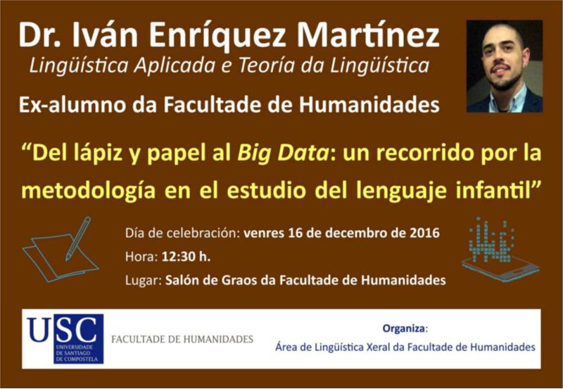 O doutor en Lingüística Aplicada e Teoría da Lingüística e investigador do Centro Ramón Piñeiro para a investigación en Humanidades Iván Enríquez Martínez ofrecerá este venres, a partir das 12.30 horas, no salón de graos da Facultade de Humanidades do Campus Terra da USC, o relatorio ‘Do lapis e papel ao Big Data: un percorrido pola metodoloxía no estudo da linguaxe infantil’.