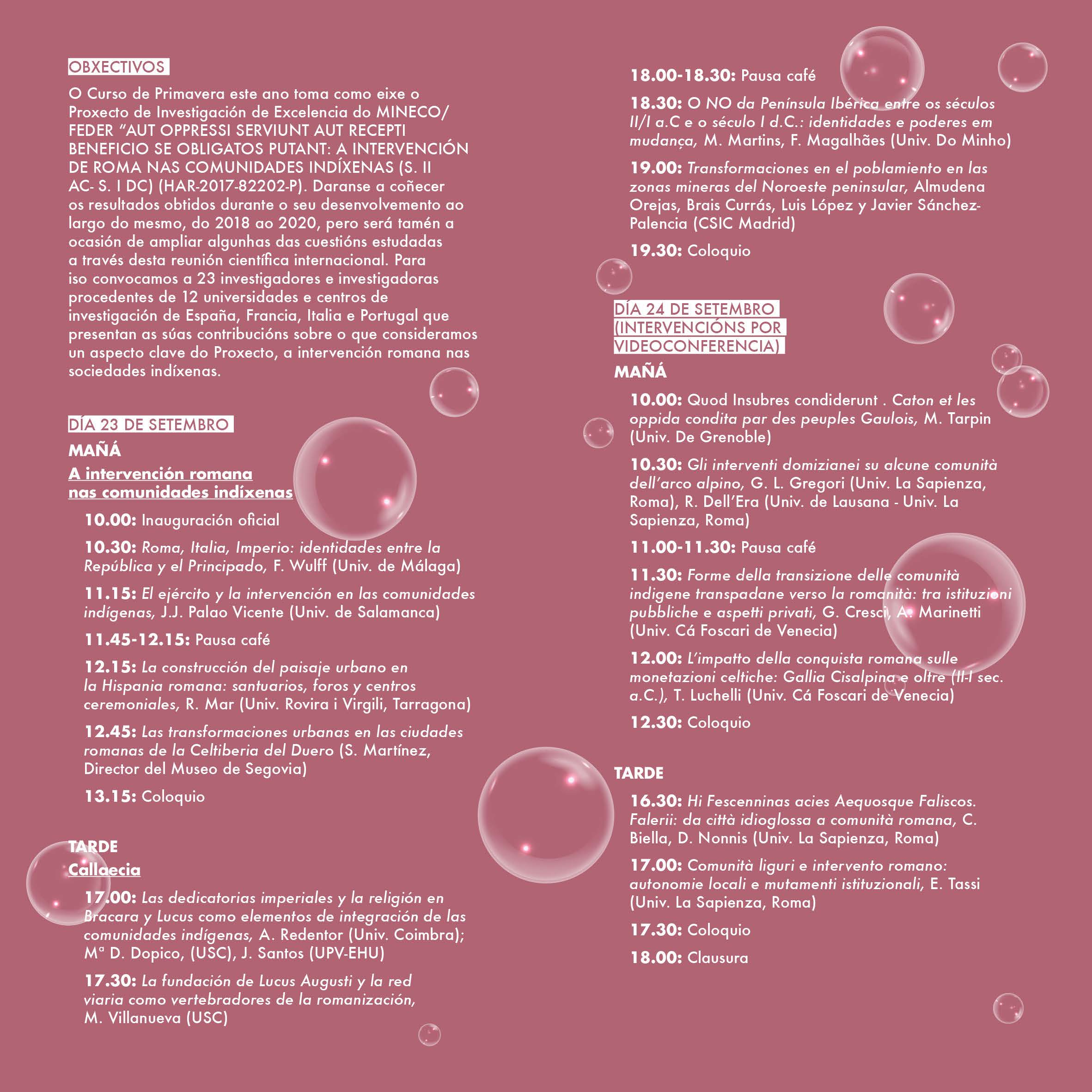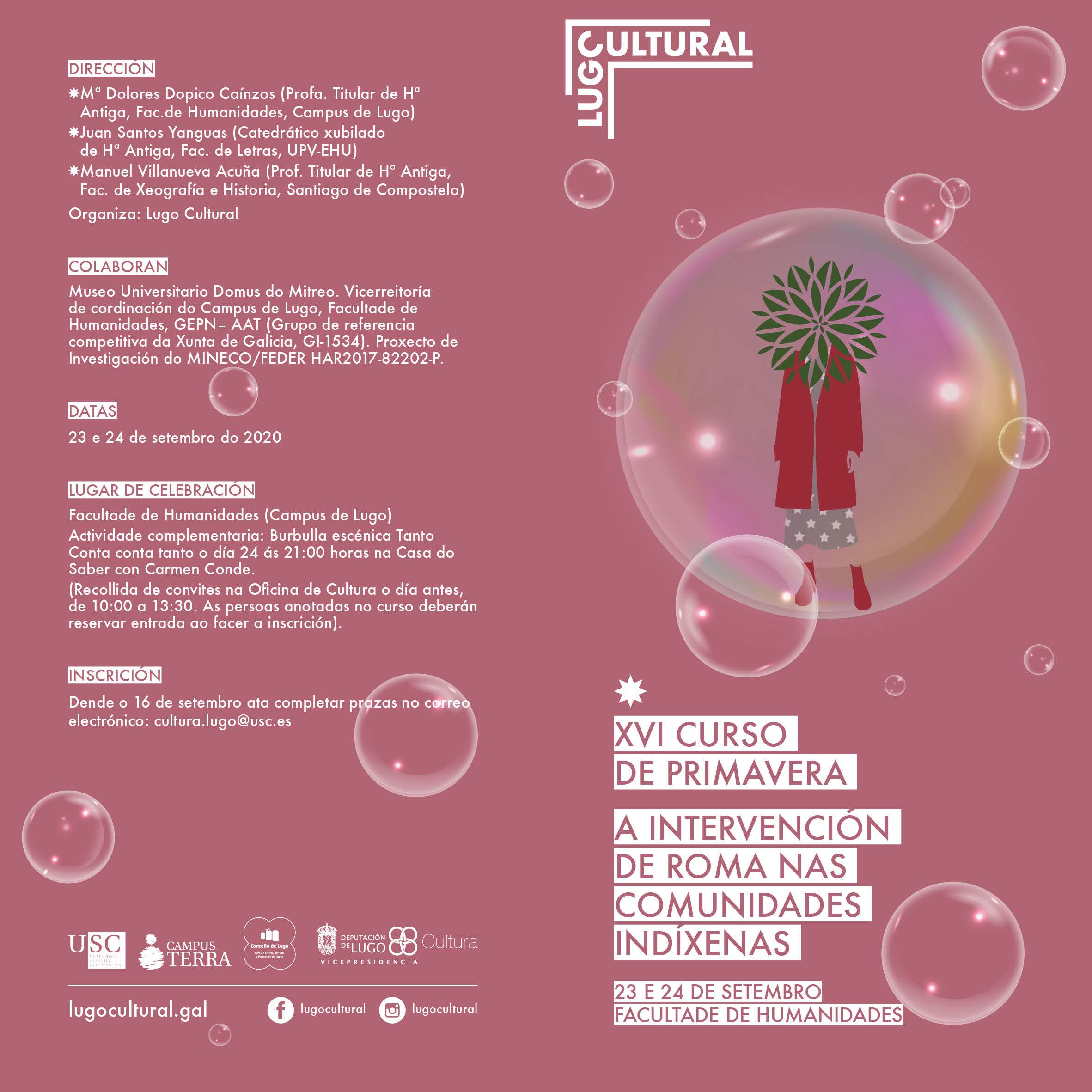 O XVI Curso de Primavera da USC, un seminario de análise e debate que se desenvolverá os días 23 e 24 de setembro na Facultade de Humanidades do Campus de Lugo, abordará a intervención de Roma nas comunidades indíxenas no marco dun intenso programa coordinado polos profesores de Historia Antiga da USC Dolores Dopico Caínzos e Manuel Villanueva Acuña, xunto co catedrático xubilado da UPV-EHU Juan Santos Yanguas, no que intervirán como relatores 23 investigadores e investigadores procedentes de doce universidades e centros de investigación de España, Francia, Italia e Portugal.