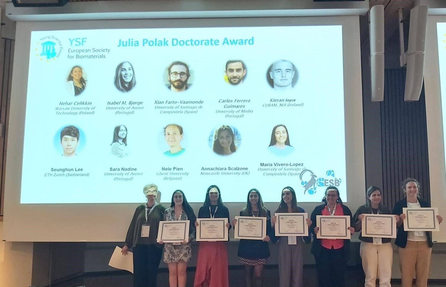 Os investigadores María Vivero López e Xián Farto Vaamonde do grupo I+DFarma, adscritos ao Instituto de Materiais da USC (iMATUS), acaban de recibir o premio europeo de doutoramento Julia Polak no transcurso da edición número 33 do Congreso Anual da Sociedade Europea de Biomateriais que se desenvolveu en Davos, Suíza. O galardón recoñece aquelas teses de doutoramento que acreditan un alto nivel de formación do investigador/a no eido dos biomateriais e a enxeñaría de tecidos e que teñan xerado resultados científicos publicados en revistas de elevado índice de impacto.