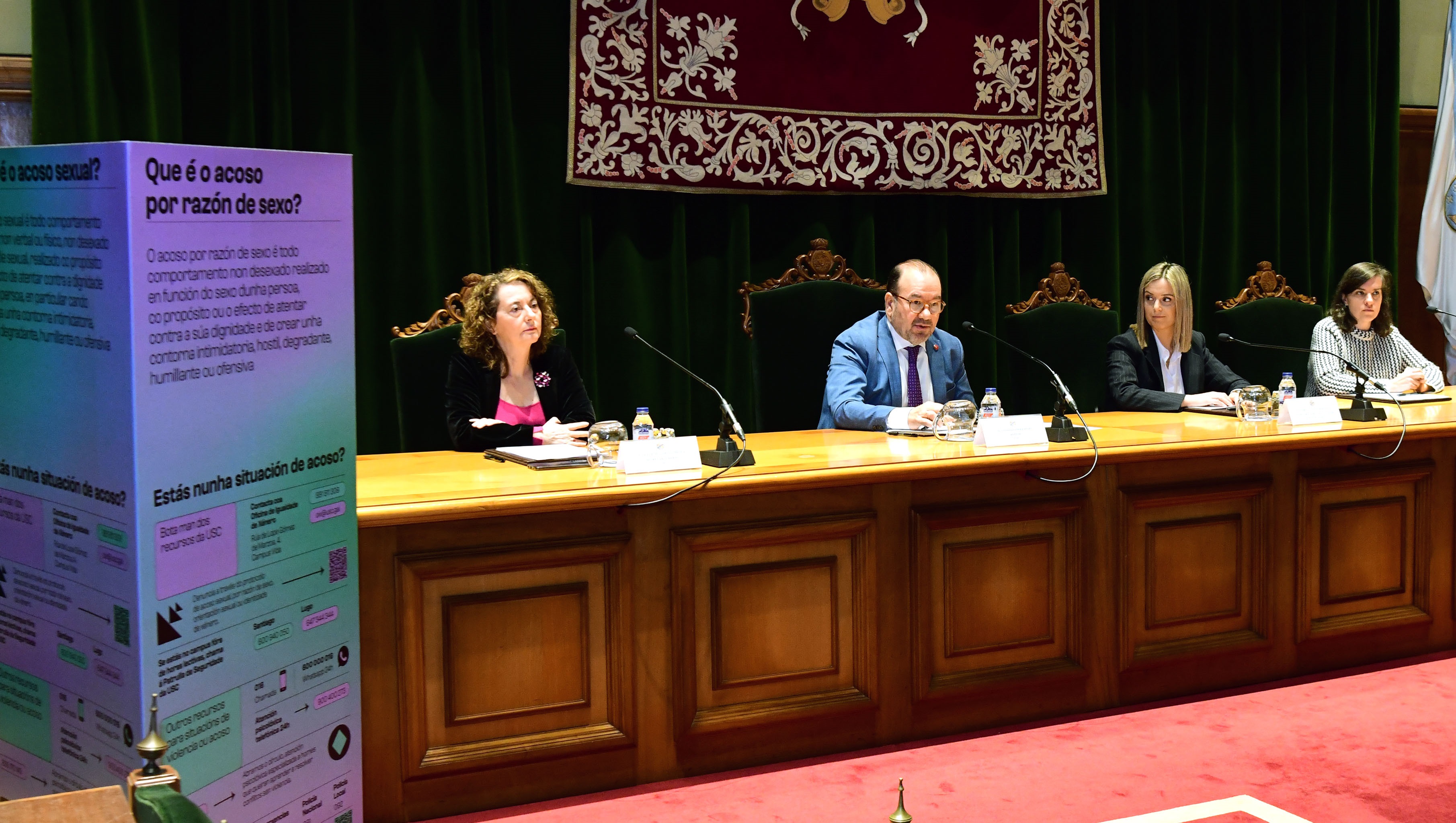 Tal e como destacou o reitor, “non podemos dar nin un paso atrás nesta loita” xa que o “elemento central” da Universidade é precisamente a educación para a igualdade. Nesta liña, Antonio López presentou a campaña Contra o acoso co que a institución pretende sensibilizar, a través de diversas canles, a comunidade universitaria nesta materia e dar a coñecer o Protocolo de prevención e actuación fronte ao acoso sexual e o acoso por razón de sexo, orientación sexual e identidade de xénero da USC. Trátase de “achegar o protocolo á comunidade universitaria e que se saiba a onde acudir cando sucede algo así”. A partir do luns 27, a campaña chegará a través de diversos recursos gráficos a bibliotecas, colexios maiores ou ás redes sociais da Universidade.