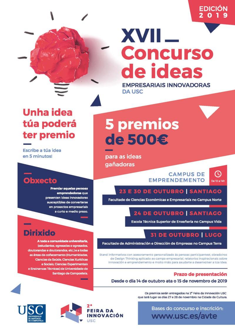 O Concurso busca premiar aquelas persoas emprendedoras que presenten ideas innovadoras susceptibles de converterse en proxectos empresariais a curto e medio prazo. O prazo para a presentación rematará o 15 de novembro e o concurso culminará os días 27 e 28 dese mesmo mes na Feira da Innovación da USC onde se darán a coñecer as ideas premiadas. En total outorgaranse cinco premios de 500 euros cada un.