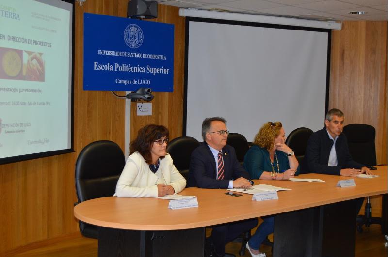 O vicerreitor de Coordinación do campus de Lugo, Javier Bueno Lema; o coordinador deste máster oficial, o tamén profesor na EPS de Enxeñaría Carlos Amiama Ares; a deputada provincial responsable da da área de Promoción económica e social , emprego, benestar e igualdade, Sonsoles López Izquierdo, Sonsoles López Izquierdo, e a secretaria académica da EPS de Enxeñaría Montserrat Valcárcel foron os encargados de dar a benvida ao novo alumnado deste posgrao universitario, un programa cuxos contidos formativos abranguen as áreas de coñecemento recoñecidas polas dúas organizacións internacionais líderes neste campo: o Project Management Institute (PMI) e a International Project Management Association (IPMA).