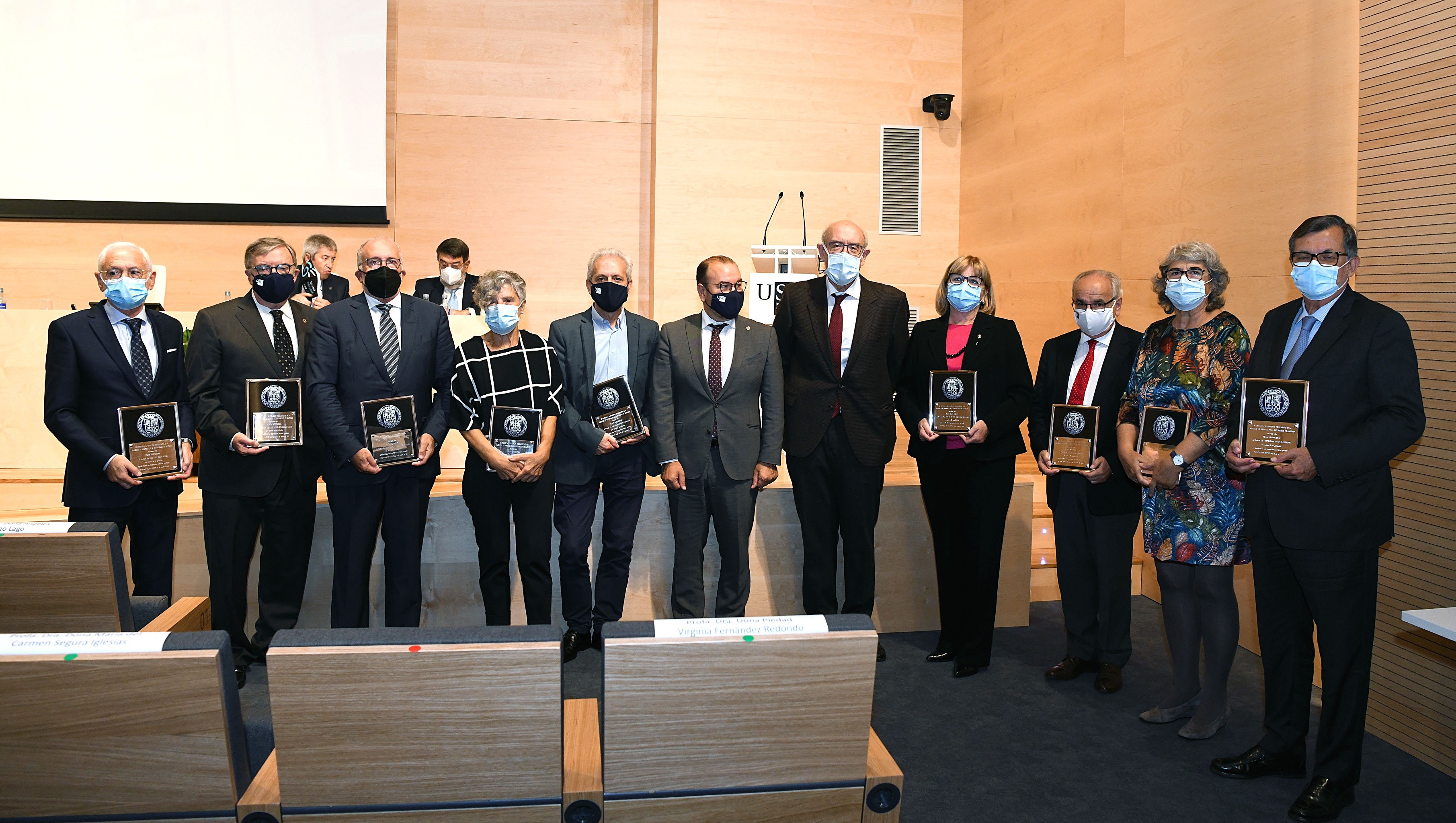A secretaría académica da Facultade de Medicina e Odontoloxía, Mª del Pilar Fernández Rodríguez, deu lectura á entrega de Placas Honoríficas da Facultade de Medicina ao profesorado xubilado durante os cursos 2019-2020 e 2020-21. Así, foron recoñecidos coas súas respectivas placas Ángeles Lorenzo Lago, Antonio Canedo Lamas, José Ramón Fernández Lorenzo, Manuel López-Rivadulla Lamas, Piedad Virginia Fernández Redondo, Mª Carmen Segura Iglesias, Alejandro Novo Domínguez, José Luis Bello López, Antonio Crespo Abelleira, Alvaro Ruibal Morell e Carlos Fernández González.