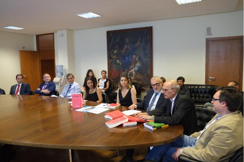 O profesor da USC e director do Observatorio Internacional da Regulación das Entidades do Sector Público (OIRESP), Marcos Almeida, e a directora da EGAP, Sonia Rodríguez-Campos, presentaron este mércores na Facultade de Dereito da USC o número monográfico extraordinario da Revista Dereito. Revista Xurídica da USC en homenaxe ao profesor António Cândido Macedo de Oliveira, presidente da Asociaçao de Estudos de Direito Regional e Local (AEDREL), que estivo presente no acto.