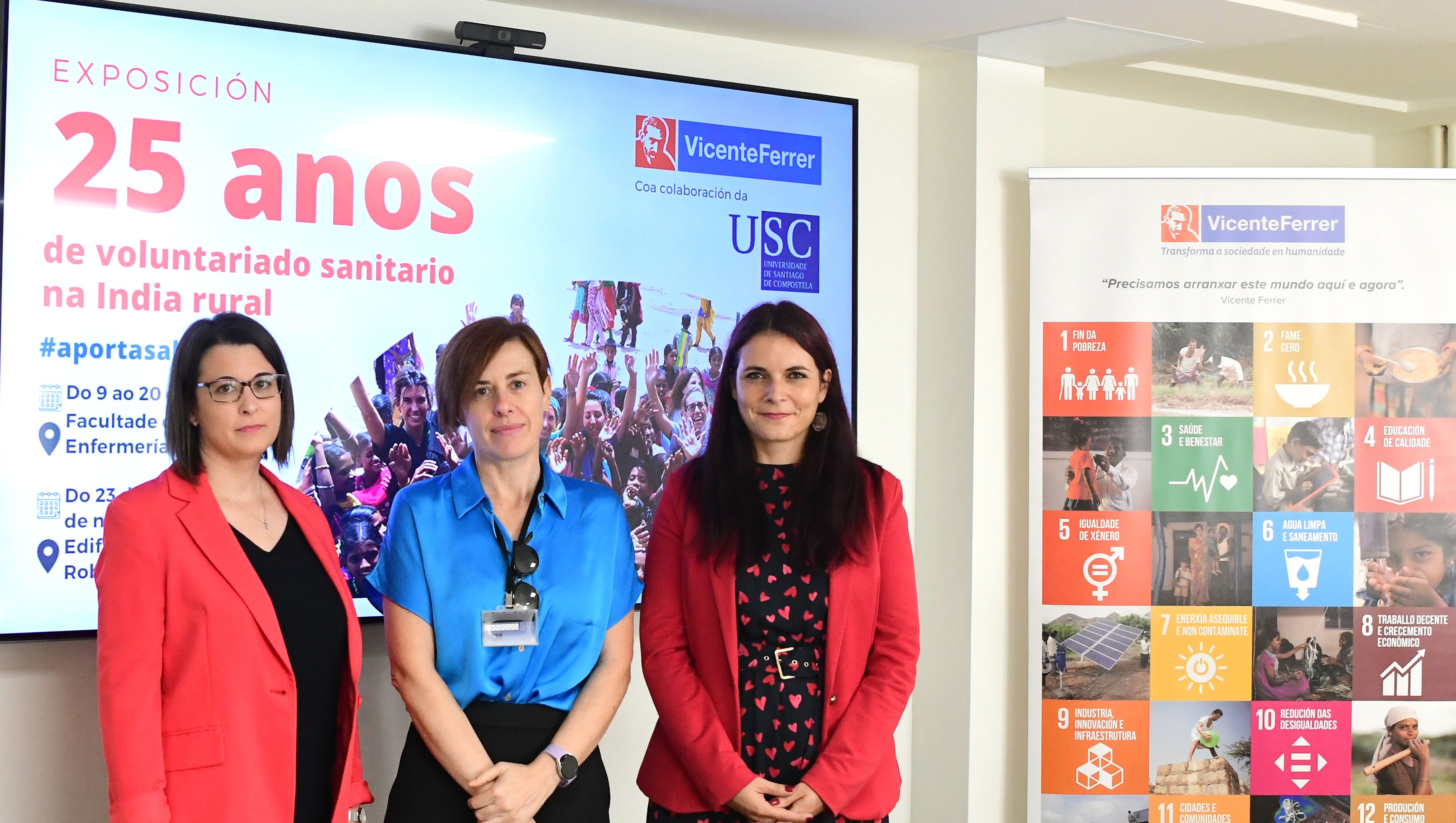 Para conmemorar o 25 aniversario de voluntariado sanitario da Fundación Vicente Ferrer (FVF) na India rural, a FVF organizou a exposición 'Achega saúde', unha mostra fotográfica que percorrerá preto de 50 centros sanitarios e educativos de toda España. A mostra foi inaugurada este luns 9 na Facultade de Enfermaría da USC, nun acto presidido pola vicerreitora de Estudantes e Cultura, Pilar Murias, e no que tamén participou a decana do centro, Raquel Rodríguez, e a delegada da Fundación Vicente Ferrer en Galicia e Asturias, María Moldes Suárez. A exposición, na que se dá a coñecer o traballo e testemuños do persoal sanitario voluntario, ten como obxectivo recoñecer e visibilizar o seu labor durante estes 25 anos e sumar máis persoas ao proxecto de sanidade da ONG.
