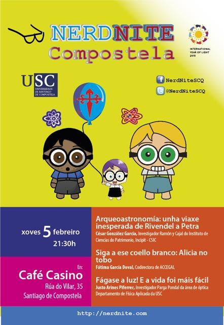 A primeira sesión das NerdNite en 2015 celebrarase este xoves 5 no Café Casino (r/ do Vilar, 35) coas intervencións dos investigadores César González García e Justo Arines Piferrer e a da co directora de ACCEGAL, Fátima García Doval. O capítulo de Compostela das NerdNites colabora en 2015 na conmemoración do Ano Internacional da Luz coa inclusión de varias charlas relativas a este tema ao longo do ano. Esta nova sesión abriraa ás 21.30 horas César González, investigador Ramon y Cajal do Instituto de Ciencias do Patrimonio (INCIPIT-CSIC), coa charla ‘Arqueoastronomía: unha viaxe inesperada de Rivendel a Petra’. Fátima García Doval tomará o relevo cunha intervención titulada ‘ Siga a ese coello branco: Alicia no tobo’. Para rematar, Justo Arines Piferrer, investigador Pargal Pondal da área de Óptica do Departamento de Física Aplicada da USC, presentará unha disertación co título ‘Fágase a luz! E a vida foi máis fácil’. Nerd As NerdNites son unha proposta nacida hai anos en Estados Unidos e á que se sumou Santiago en 2012, sendo a primeira cidade española en facelo. Articúlase en base a pequenas charlas científicas con contidos chamativos, onde especialistas dialogan co público das disciplinas que lles apaixonan fóra do ámbito académico, nun ton distendido e en horario nocturno. Están organizadas pola Área de Cultura da Vicerreitoría de Estudantes, Cultura e Responsabilidade Social.