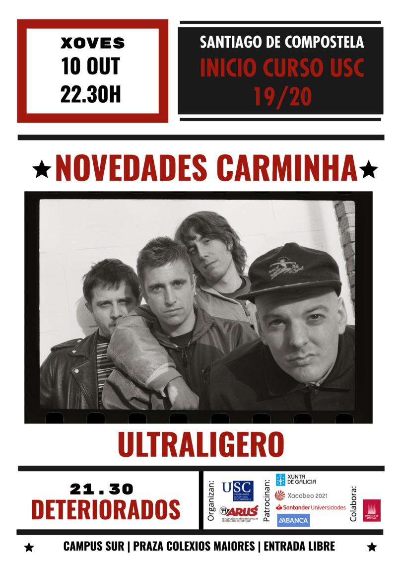 O repertorio de Novedades Carminha arrancará ás 22.30 horas tendo como eixo o seu último traballo Ultraligero, “un álbum de concepto en torno á musica de baile, un recopilatorio de singles e o repertorio máis sólido e coherente” deste grupo ata a momento. Trátase dun “exercicio que os presenta como unha banda portadora da bandeira do romanticismo macarra á pista de baile”. Novedades Carminha “acércanse a rexistros como o dub, a rumba, o funk-soul, a cumbia, a música disco, o chiptune, o hip-hop máis espacial ou o dancehall e impoñendo a súa particular marca en cada un dos seus movementos”.