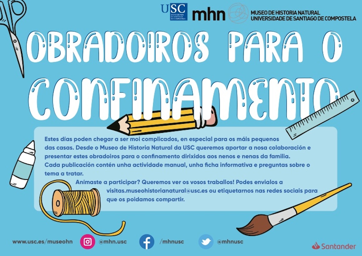 O Museo de Historia Natural (MHN) da USC está a impulsar durante o confinamento unha serie de obradoiros dirixidos aos nenos e nenas a través da súa páxina web. Cada martes e cada xoves, o MHN publica unha actividade manual, ficha informativa e preguntas sobre o tema a tratar. O alumnado participante pode enviar os resultados dos seus exercicios ao enderezo electrónico visitas.museohistorianatural [at] usc.es (visitas[dot]museohistorianatural[at]usc[dot]es)