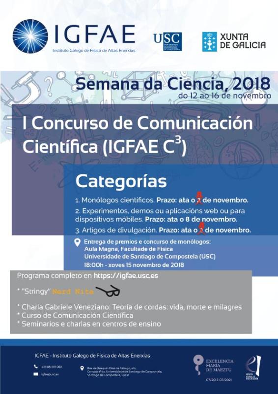 Xa o xoves 15 será a quenda do Concurso de Comunicación Científica do IGFAE, nunha sesión a partir das 18.00 horas na que se resolverá a competición de monólogos científicos e se entregarán os premios das categorías de artigos e experimentos, demostracións ou aplicacións móbiles. De xeito paralelo, entre os mércores 14 e o venres 16 desenvolverase un ‘Curso de Comunicación Científica’ a cargo de Eduardo Sáenz de Cabezón e Héctor Urién para o que é preciso realizar inscrición previa e que está dotado cunha carga lectiva de 13 horas.
