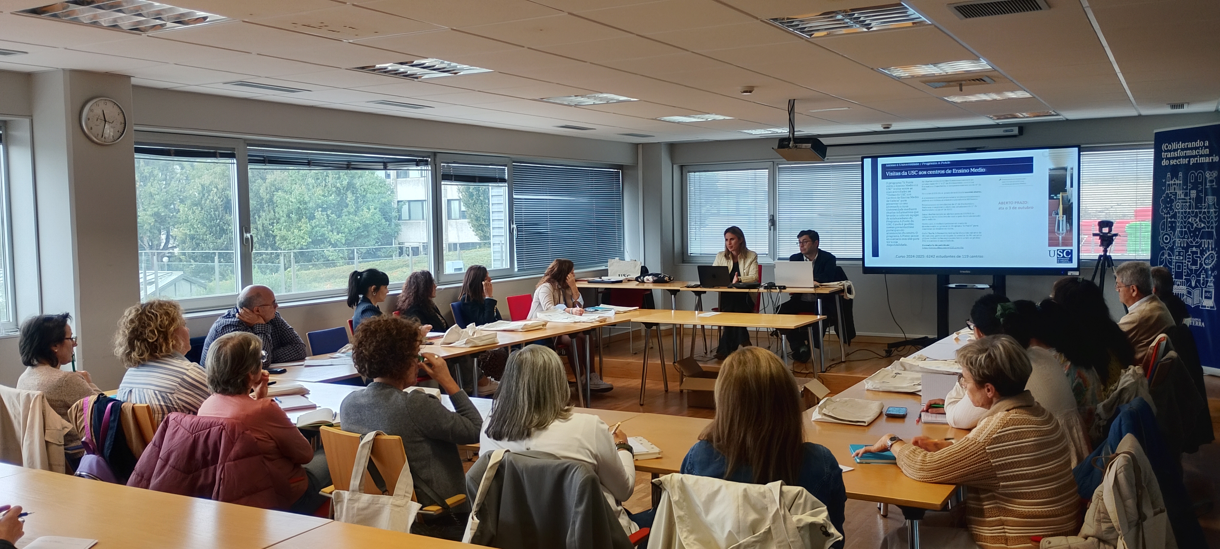 O Campus de Lugo acolleu este martes persoal directivo e orientador dunha vintena de centros de ensino medio de toda Galicia para coñecer as actividades para este curso do programa A Ponte da USC así como as novidades da PAU de 2026.