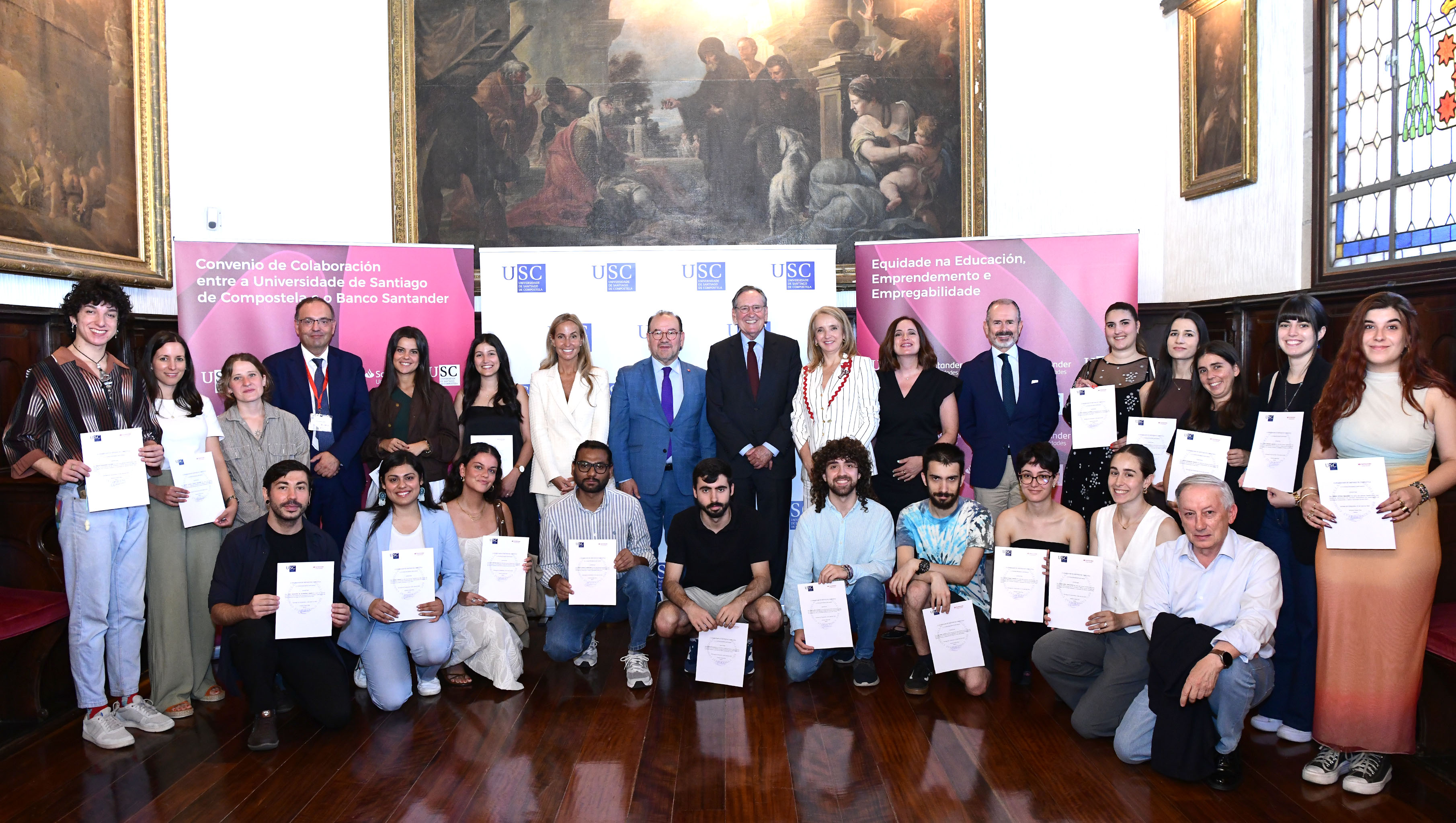 As persoas beneficiarias de Bolsas Santander para contratos predoutorais e para persoal investigador de iniciación para estudantado de mestrado recolleron este martes en San Xerome as súas credenciais. O acto presidiuno no Salón de Graos de San Xerome o reitor da Universidade de Santiago, Antonio López, e nel participaron tamén o vicepresidente segundo de Banco Santander, Matías Rodríguez Inciarte, e a directora de Santander Universidades e Universia España, Susana García Espinel.