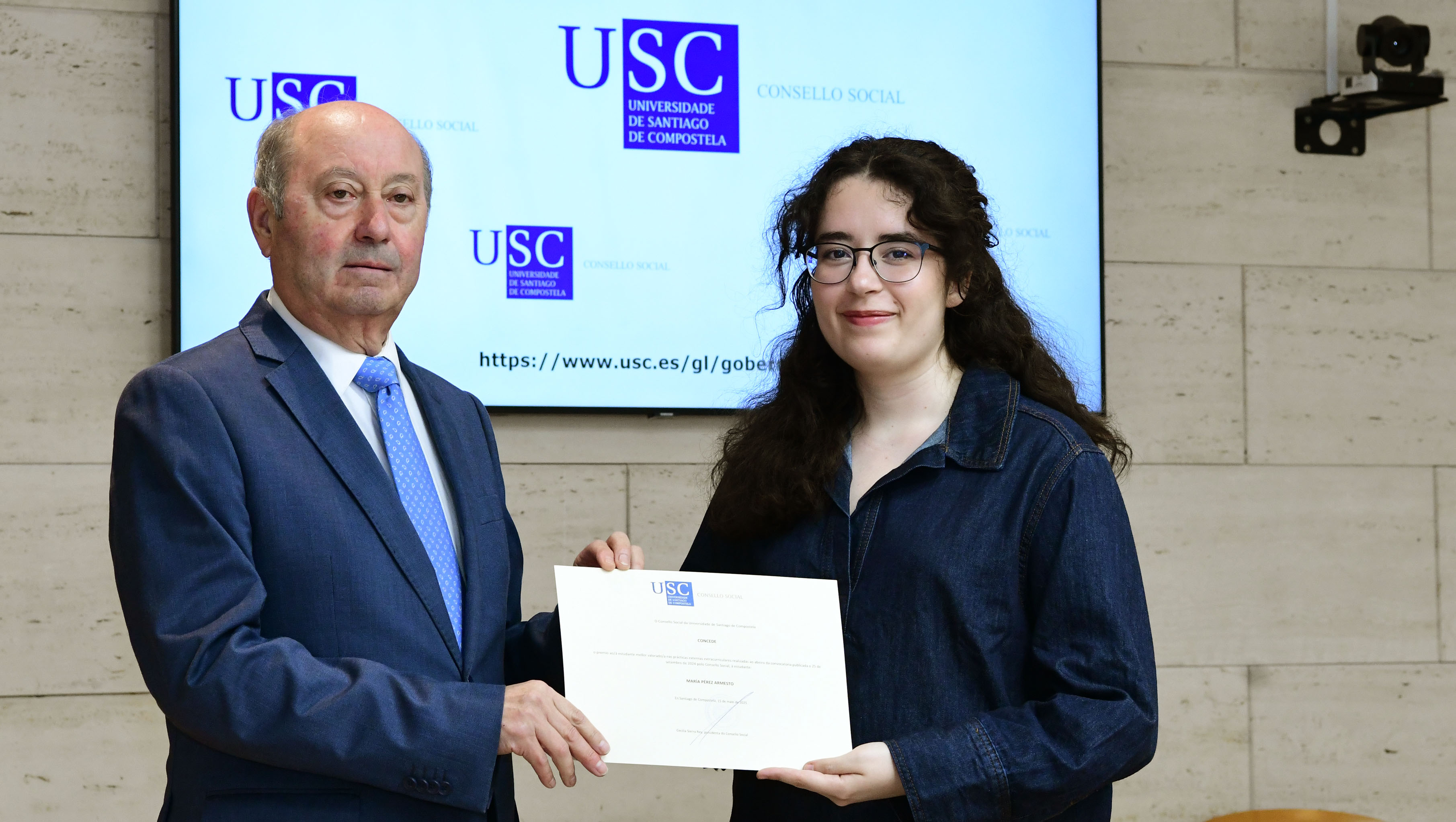 “Para min foi unha sorpresa obter este recoñecemento, que me serve de aliciente para continuar a carreira investigadora. As prácticas, e o premio, dalgún xeito abríronme o camiño para determinar o meu futuro”, asegura María, que recibiu o premio de mans de José Villarnovo Faraldo, membro do Consello Social que actuou en substitución da presidenta.