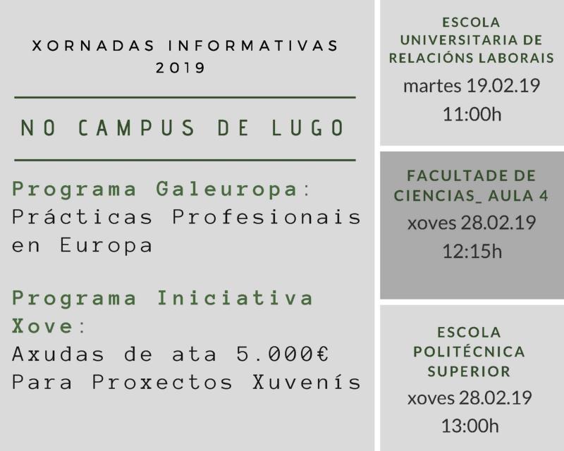 A charla informativa que guiará este martes Zoe Prieto, a partir das 11.00 horas, na escola universitaria de Relacións Laborais, será a primeira das tres que ofrecerá esta dinamizadora xuvenil da Xunta de Galicia ao longo deste mes no campus de Lugo. De feito, Prieto tamén informará das características destes programas a alumnado e titulados da EPS de Enxeñaría e da Facultade de Ciencias do campus de Lugo o vindeiro xoves 28 de febreiro.