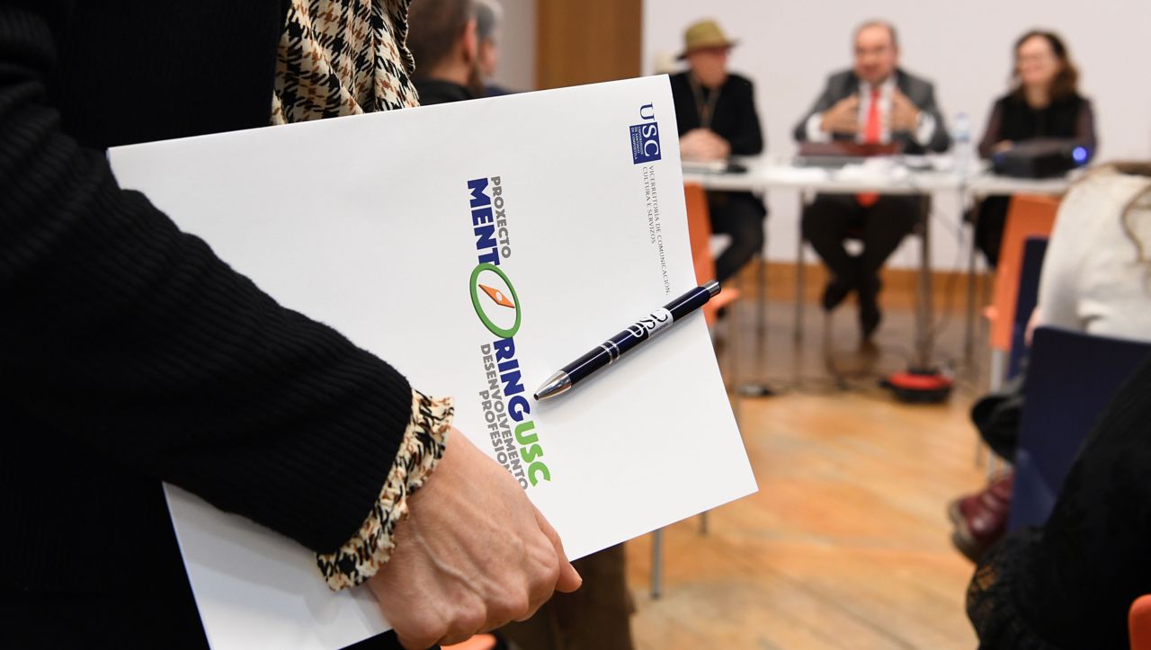 O Programa Mentoring reuniu este venres a unha representación dos preto de 100 profesionais e directivos que exercerán como mentores e mentoras do alumnado inscrito nesta iniciativa da USC, para asesoralos na súa inserción laboral. A sesión de networking que se desenvolveu na Casa Jimena e Elisa Fernández de la Vega permitiu que as persoas participantes tomasen contacto coas ferramentas máis acaídas no proceso de mentorización, así como o intercambio de puntos de vista entre integrantes veteranos e de nova incorporación. O reitor Antonio López e a vicerreitora de Comunicación Cultura e Servizos Mar Lorenzo Moledo deron a benvida aos participantes na sesión.