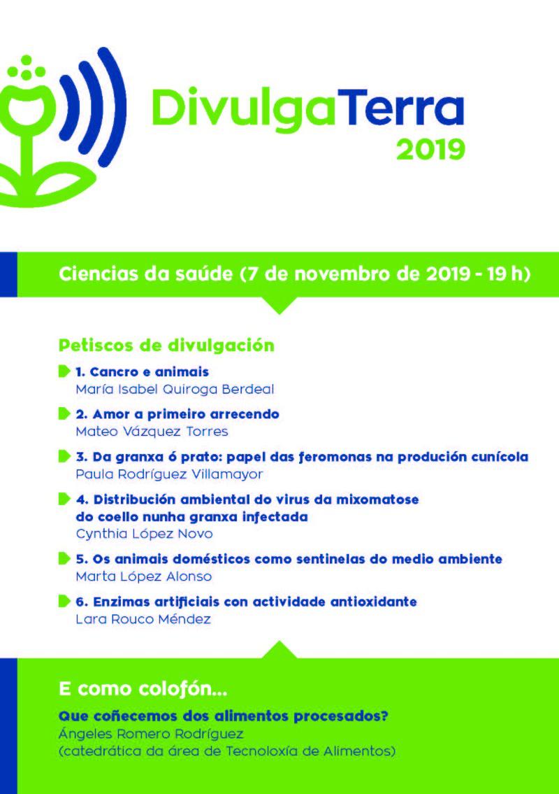 A mocidade investigadora tamén será protagonista neste espazo de debate e divulgación científica en lingua galega. Así, DivulgaTerra 2019 dará voz esta tarde a Mateo Vázquez Torres, Paula Rodríguez Villamayor, Cynthia López Novo e Lara Rouco Méndez, investigadores novos todos eles que ofrecerán charlas con títulos suxestivos, como o son ‘Amor a primeiro arrecendo’, ‘Da granxa ao prato: papel das feromonas na produción cunícola’, ‘Distribución ambiental do virus da mixomatose do coello nunha granxa infectada’ ou ‘Enzimas artificiais con actividade antioxidante’.