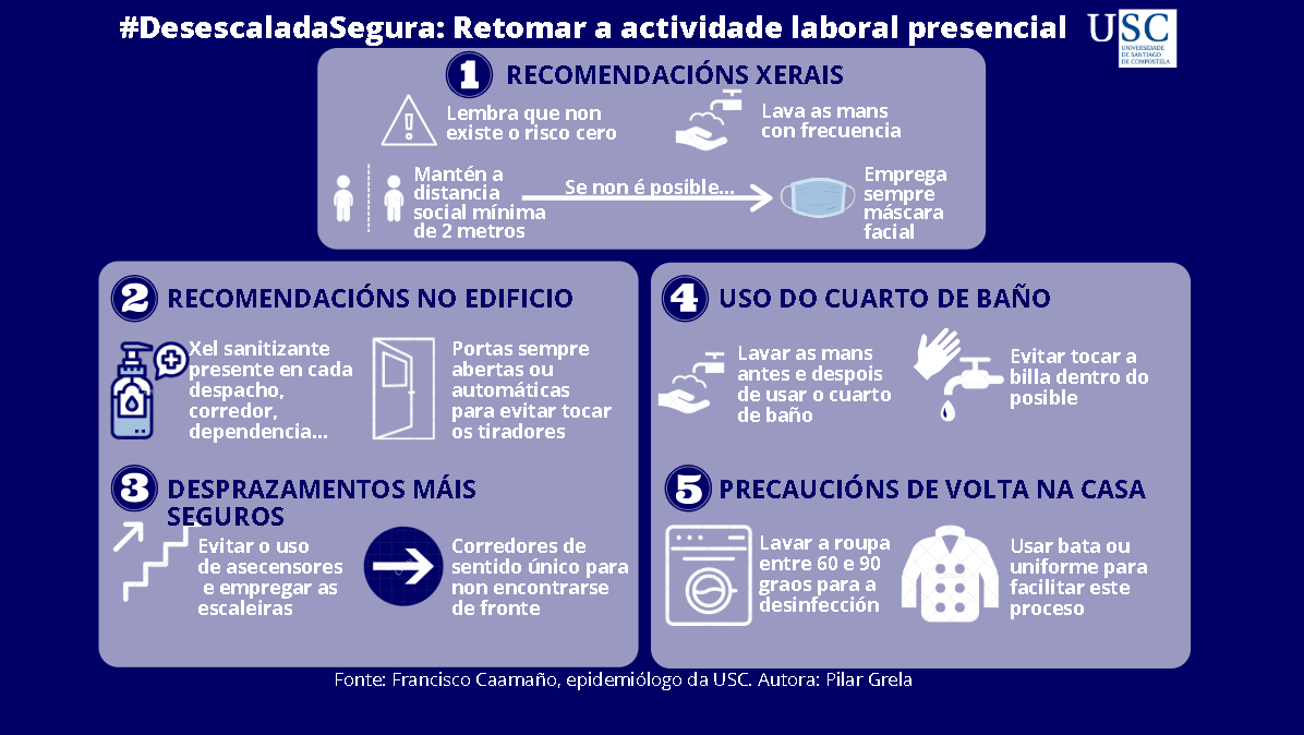 O paulatino regreso ao traballo presencial no marco da crise por mor da COVID-19 debe realizarse extremando as medidas de precaución. Neste senso, o epidemiólogo e profesor da USC Francisco Caamaño Isorna afirma que "o risco cero non existe" e apunta a que "a medida fundamental é a distancial social e o lavado sistemático e meticuloso de mans con xabón ou xel sanitizante".