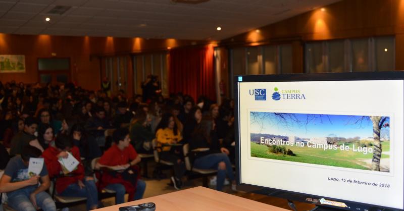 Estudantes de ensino medio procedentes de sete centros educativos das provincias de Lugo e da Coruña visitan este martes 24 de abril os centros universitarios da USC radicados en Lugo a través da xornada ‘Encontros no Campus Terra de Lugo’, unha iniciativa enmarcada no programa ‘A Ponte entre o Ensino Medio e a USC’ e orientada a dar a coñecer a oferta de estudos e servizos da USC nesta sede universitaria a estudantes preuniversitarios.