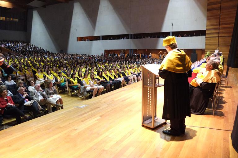 O reitor Juan Viaño pechou a quenda de intervencións do acto de graduación da promoción 2009-2015 de Medicina animando aos futuros titulados e tituladas a tecer “unha rede calidade á que vos debedes pertencer dende un primeiro momento”. Aludía así ao reitor á oportunidade que tiveron os futuros profesionais da Medicina durante a súa etapa universitaria de “coñecer de primeira man a reputados docentes e investigadores que xa foron referencia no mundo e que fan descubrimentos que nos melloran a vida dun xeito patente”. Viaño animounos a aproveitar “a experiencia, gardade o recordo, pero non dubidedes en chamalos sempre que o precisedes”. A partir da idea de que “o mundo non cambia estando quietos”, o reitor animou aos futuros titulados e tituladas a alcanzar novas metas ao tempo que sinalou a pretensión da USC de traballar na definición dunha infraestrutura a partir dun modelo realista dende o punto de vista económico que cumpra unha función clara en canto á formación e construír “un ecosistema que nos permita seguir falando de bos profesionais nos vindeiros anos”. No acto celebrado este mércores ante os integrantes da promoción e as súas familias, Viaño reafirmou a súa crenza no modelo formativo utilizada na Facultade de Medicina, “temos que garantir os coñecementos teóricos, pero tamén a formación práctica e por suposto a investigación”. “Queremos ensinar o que está nos libros” engadiu, “pero tamén debemos facer un esforzo importante por darlle pulo a todos aqueles que queren descubrir e crear o coñecemento que mañá se estudará neses mesmos libros”. Xunto ao reitor tamén participaron o decano da Facultade de Medicina e Odontoloxía, Juan Gestal; o xerente do Complexo Hospitalario Universitario de Santiago, Luis Verde Remeseiro; o presidente do Consello de Colexios Médicos de Galicia, Luciano Vidán Martínez; e o presidente da Real Academia de Medicina de Galicia, José Carro Otero, entre outras personalidades. Na xornada celebrada no Palacio de Congresos, logo da intervención do padriño da promoción, o doutor Juan Domínguez Muñoz, e da proxección de dous vídeos conmemorativos da distintos momentos da etapa universitaria desta promoción, tomaron a palabra Yago Vilela González en representación do alumnado, ao que seguiu a entrega de diplomas conmemorativos. A quenda de palabra do decano da Facultade de Medicina, precedeu á lectura da Declaración de Xenebra por parte de Susana Martínez García e Daniel Falkenhain López. Foto: Servimav-USC