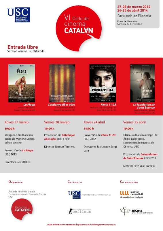 O VI Ciclo de Cinema Catalán desenvolverase os días 27 e 28 de marzo e 24 e 25 de abril na Facultade de Filosofía, organizado pola Área de Catalán do Departamento de Filoloxía Galega. O programa intégrano catro filmes de denuncia social recoñecidos e premiados en distintos festivais. O programa comezará este xoves 27 coa intervención do crítico de cine Moncho Lemos, e dará paso á proxección de La Plaga de Neus Ballús. Xa o venres 28 será a quenda de Catalunya über alles de Ramon Térmens . No mes de abril, Fènix 11*23 de Joel Joan e Sergi Lara proxectarase o día 24 e La lapidation de Saint Étienne de Pere Vilà i Barceló o día 25. Todas as proxeccións son de entrada libre e comezarán ás 19.00 horas. Na clausura, o ciclo contará coa presenza do catedrático de Historia do Cine, Ángel Luis Hueso. Todos os filmes proxectaranse en versión orixinal subtitulada e irán emmarcados cunha breve presentación e coloquio.