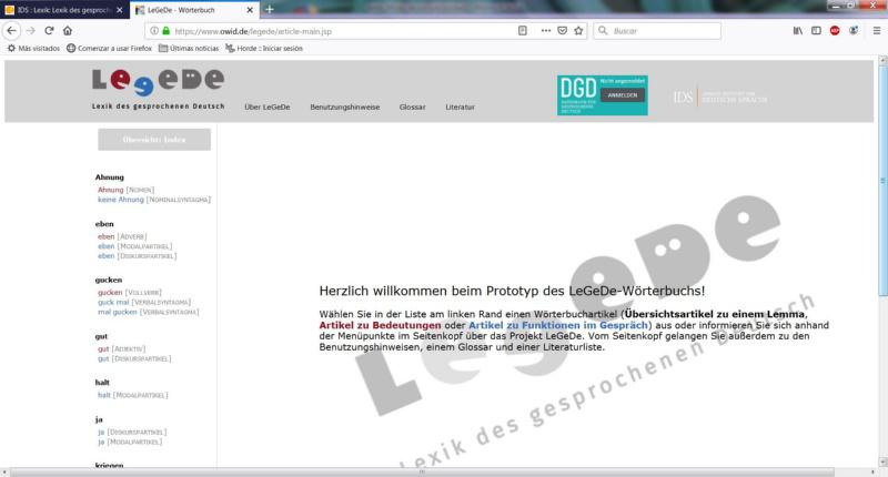 Froito de tres anos de traballo, LeGeDe é o primeiro prototipo lexicográfico en liña sobre peculiaridades léxicas do idioma alemán falado en situacións interactivas. Para o seu desenvolvemento, a profesora da área de Filoloxía Alemá da USC Meike Meliss dirixiu un equipo de investigación interdisciplinar agrupado no proxecto Lexik des gesprochenen Deutsch (O léxico do alemán falado). O desenvolvemento deste proxecto entre 2016 e 2019, e para o que a profesor Meliss gozou dunha excedencia académica, realizouse no Instituto de Investigación da Lingua Alemá Leibniz de Mannheim (IDS) con financiamento da asociación científica alemá Leibniz (Leibniz Gemeinschaft). Os datos deste prototipo baséanse en FOLK, un corpus lingüístico do alemán oral, integrado na Base de Datos do alemán falado (DGD) do IDS.