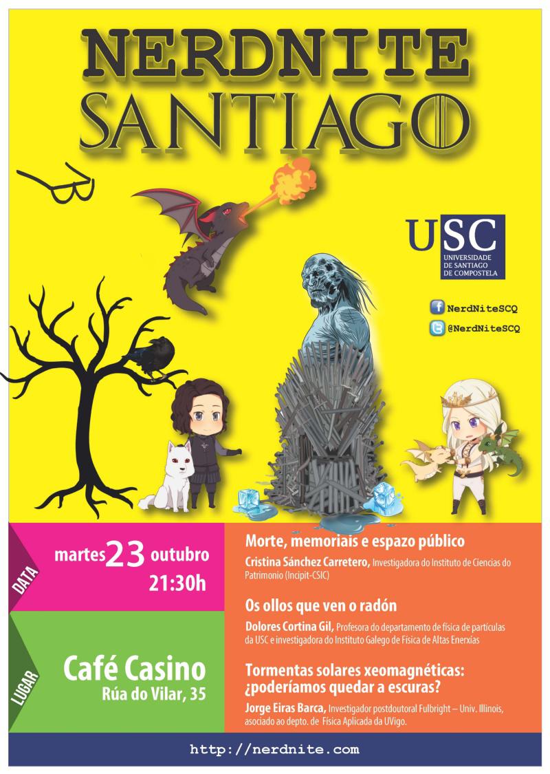 Este martes 22 comeza unha nova edición das NerdNites, nas que se falará de morte, memoriais e espazo público, do radon e da posibilidade de quedar bloqueados por unha tormenta solar. A cita, de entrada libre, será ás 21.30 horas no café Casino.