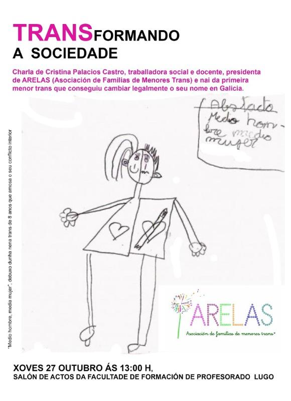 Nesta sesión, organizada polo profesor da Área de Plástica do Departamento de Didácticas Aplicadas da USC Vicente Blanco, Cristina Palacios, tratará de dar visibilidade a unha realidade socialmente oculta como é a dos menores transexuais. A nai da primeira menos que conseguiu mudar legalmente o seu nome en Galicia aproveitará a súa intervención para mostrar as vivencias, necesidades e realidades dun colectivo minoritario, vulnerable e socialmente rexeitado, como é o das persoas transexuais. O traballo que está a desenvolver a asociación Arelas neste eido, ademais do protocolo educativo sobre identidade de xénero elaborado en colaboración coa Consellería de Educación da Xunta de Galicia, serán outras das cuestións sobre as que disertará Cristina Palacios no marco dunha sesión aberta ao público e de entrada libre e de balde para todas as persoas interesadas.