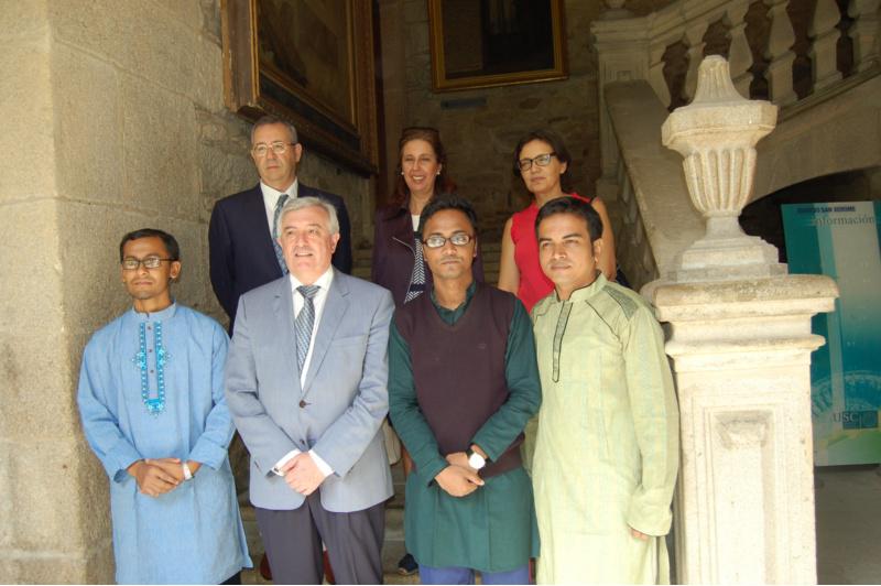O reitor da Universidade de Santiago, Juan Viaño, recibiu este venres no seu despacho de San Xerome os tres alumnos da Cátedra Inditex de Lingua e Cultura Españolas na Universidade de Daca (Bangladés) que, tras un rigoroso proceso de selección, acadaron unha bolsa para facer un curso de verán de español na institución docente compostelá. Shakhaowat Hossain, Md Sariful Islam e Mirza Wasfi Jabber visitaron a Reitoría acompañados do subdirector da cátedra e próximo director, o profesor da USC Santiago Fernández Mosquera; da profesora da USC e futura subdirectora a partir do vindeiro curso, Victoria Vázquez Rozas; e da coordinadora da Cátedra, Amparo Porta. A Cátedra Inditex, que na actualidade dirixe o profesor da UDC Mauro Fernández, iniciou as súas actividades en 2011 grazas a un convenio asinado entre a multinacional téxtil galega e as Universidades de Santiago de Compostela e A Coruña en España e a de Daca en Bangladés. Entre outros obxectivos, a cátedra promove o intercambio e a produción científica no seu ámbito de estudo así como a mobilidade de estudantes e docentes entre as institucións universitarias. No seu primeiro ano académico o número de estudantes nos cursos de español foi de 123, una cifra que se foi incrementando ao longo dos seguintes ata chegar aos 230 no de 2014-2015 que concluíu este pasado mes de maio. En total, participaron nestes cursos 958 persoas. Cabe sinalar que a porcentaxe de alumnas matriculadas foi ascendendo progresivamente –do 21% o primeiro ano ao 44% deste último–, conformando una ratio de 36% que supera o promedio de matriculadas na propia Universidade de Dhaka. Dende o verán de 2013, entre os mellores alumnos de cada promoción faise una selección de tres estudantes para que viaxen a España a realizar o curso de verán en Santiago de Compostela. A bolsa da que gozan os tres estudantes que hoxe recibiu o Reitor –dous graduados en Desenvolvemento e un en Socioloxía– inclúe a viaxe, o curso, o aloxamento, a manutención e as actividades que a maiores contempla o curso, ademais dunha cantidade de diñeiro en metálico. Actividade da cátedra Dentro do marco das actividades docentes, a cátedra asinou ata agora dous grandes convenios de colaboración. Un co Instituto Cervantes para administrar o exame DELE (Diploma de Español como Lingua Estranxeira), de maneira que a cátedra é o único centro de exame en Bangladés para obter este diploma, no que xa participaron 44 estudantes nestes últimos dous anos. O outro acordo asinouse co Ministerio de Asuntos Exteriores do Goberno de Bangladés para dar clases de español ao alumnado da Escola Diplomática dese país. Ademais de actividades de promoción da lingua e cultura españolas –moitas delas para o público en xeral–, a cátedra ofrece ao seu alumnado seminarios monográficos de cultura (xeografía de Latinoamérica, historia de España, etc.), ciclos de cinema, concursos e conferencias agrupadas baixo o título xenérico ‘Bangladés fala español’ no que distintas persoas de España e países latinoamericanos contan a súa experiencia no país asiático. De esquerda á dereita: Md Sariful Islam, Juan Viaño, Shakhaowat Hossain, Mirza Wasfi Jabber e Santiago Fernández Mosquera, Amparo Porta, Victoria Vázquez Rozas