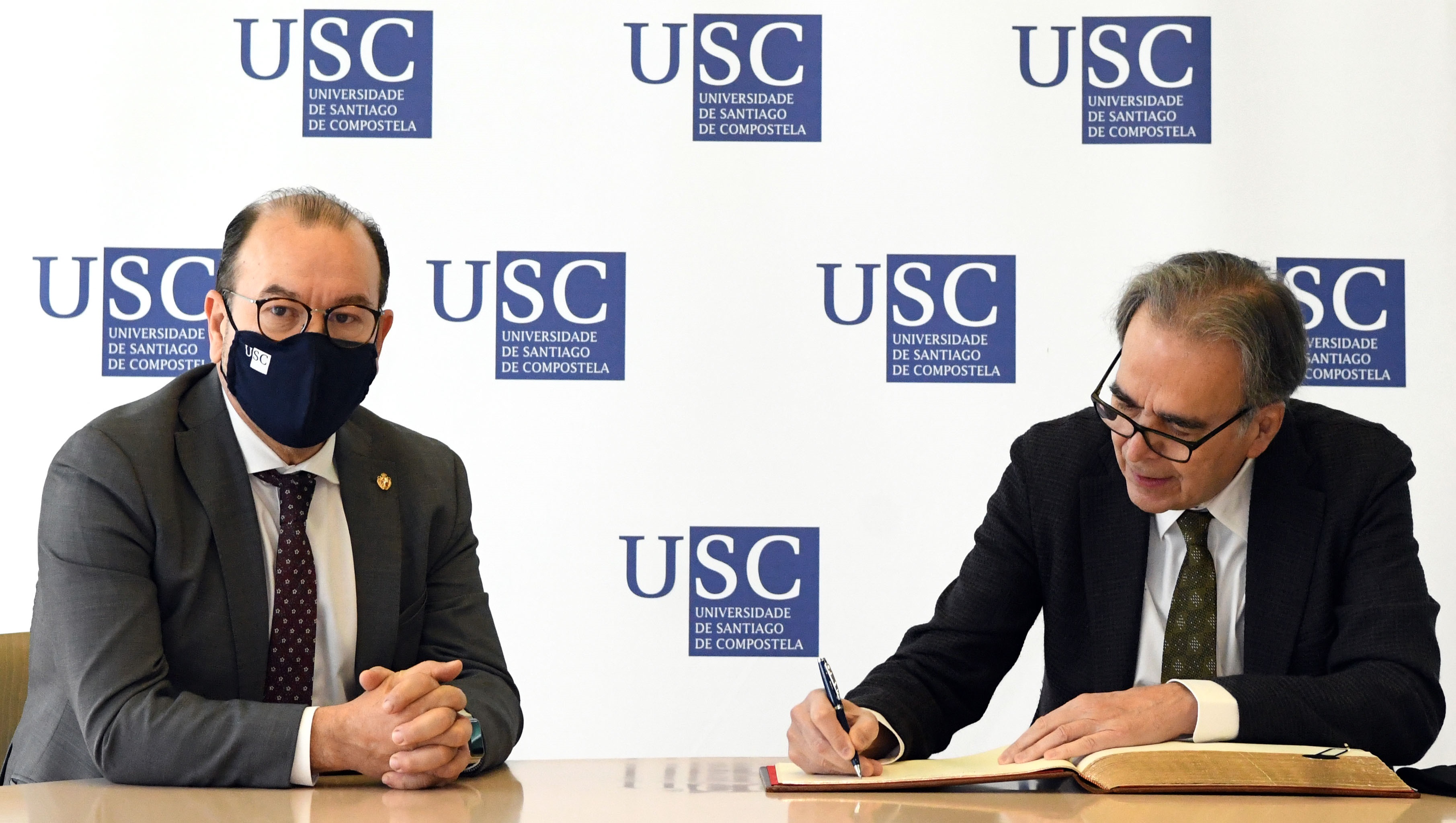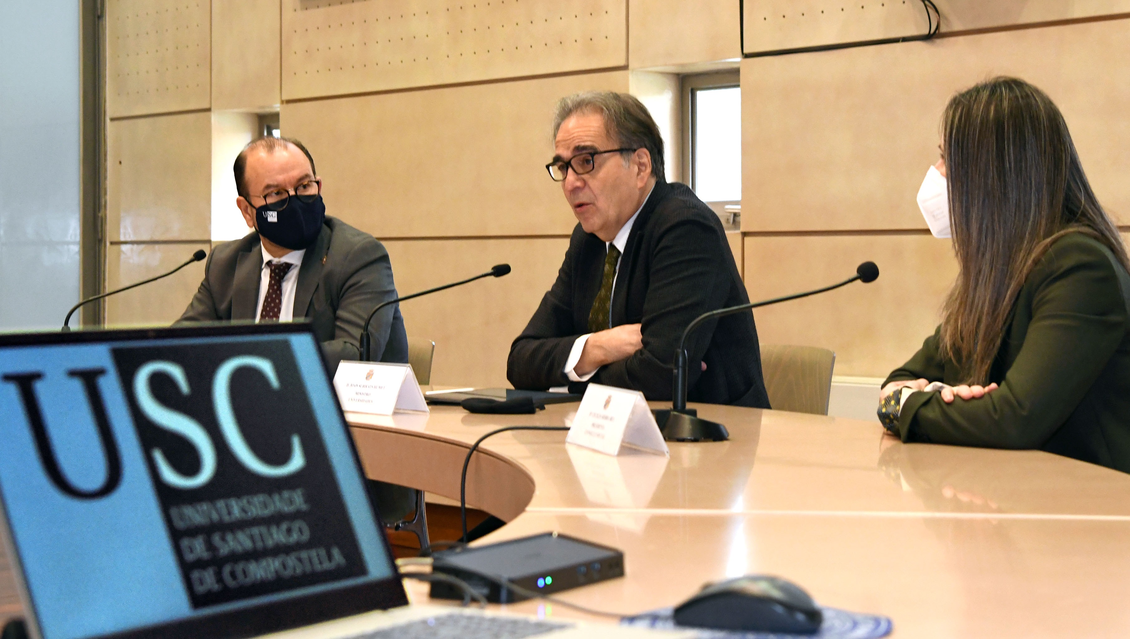 O reitor Antonio López e o ministro de Universidades Joan Subirats mantiveron unha xuntanza este luns 21 no Centro de Estudos Avanzados da USC na que abordaron diversas cuestións relativas á internacionalización, financiamento do sistema universitario, equilibrio entre docencia e investigación, oferta académica ou a atención á saúde mental, entre outros asuntos. Subirats foi recibido polo reitor e os demais integrantes do equipo de goberno —tanto do equipo entrante como do saínte— para, xusto a continuación, asinar no Libro de Honra da institución. Despois desta primeira xuntanza, desenvolveuse unha reunión de traballo á que foron convidadas as persoas que integran o Consello de Goberno da USC.