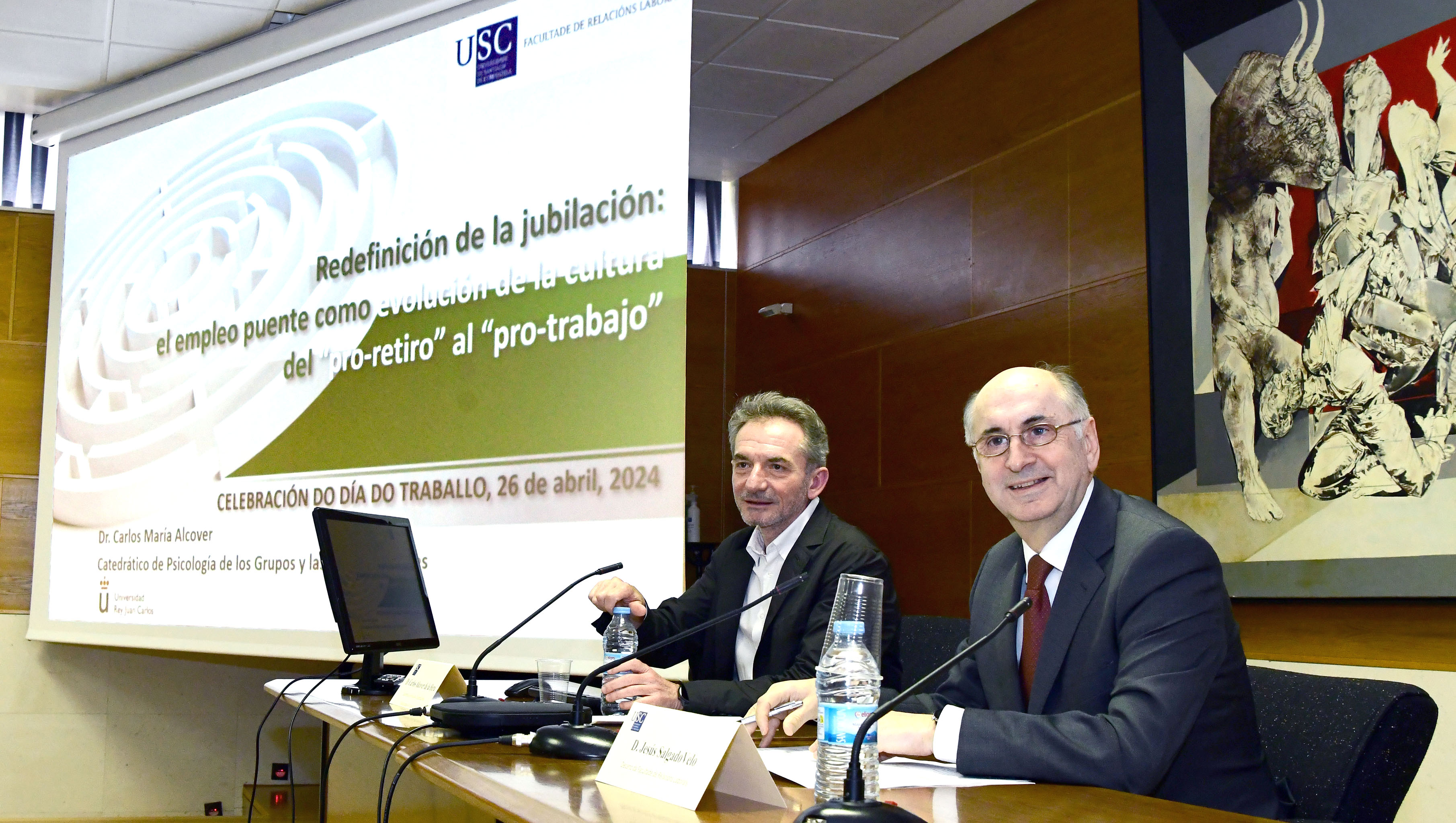A Facultade de Relacións Laborais conmemorou este venres o Día do Traballo, 1 de maio, coincidindo coa celebración do Día do Centro, cun acto presidido polo decano do centro, Jesús F. Salgado Velo. A parte central foi a conferencia ‘Redefinición da xubilación: o emprego ponte como evolución da cultura do pro-retiro ao pro-traballo’, a cargo de Carlos María Alcover de la Hera, catedrático de Psicoloxía Social da Universidade Rey Juan Carlos.