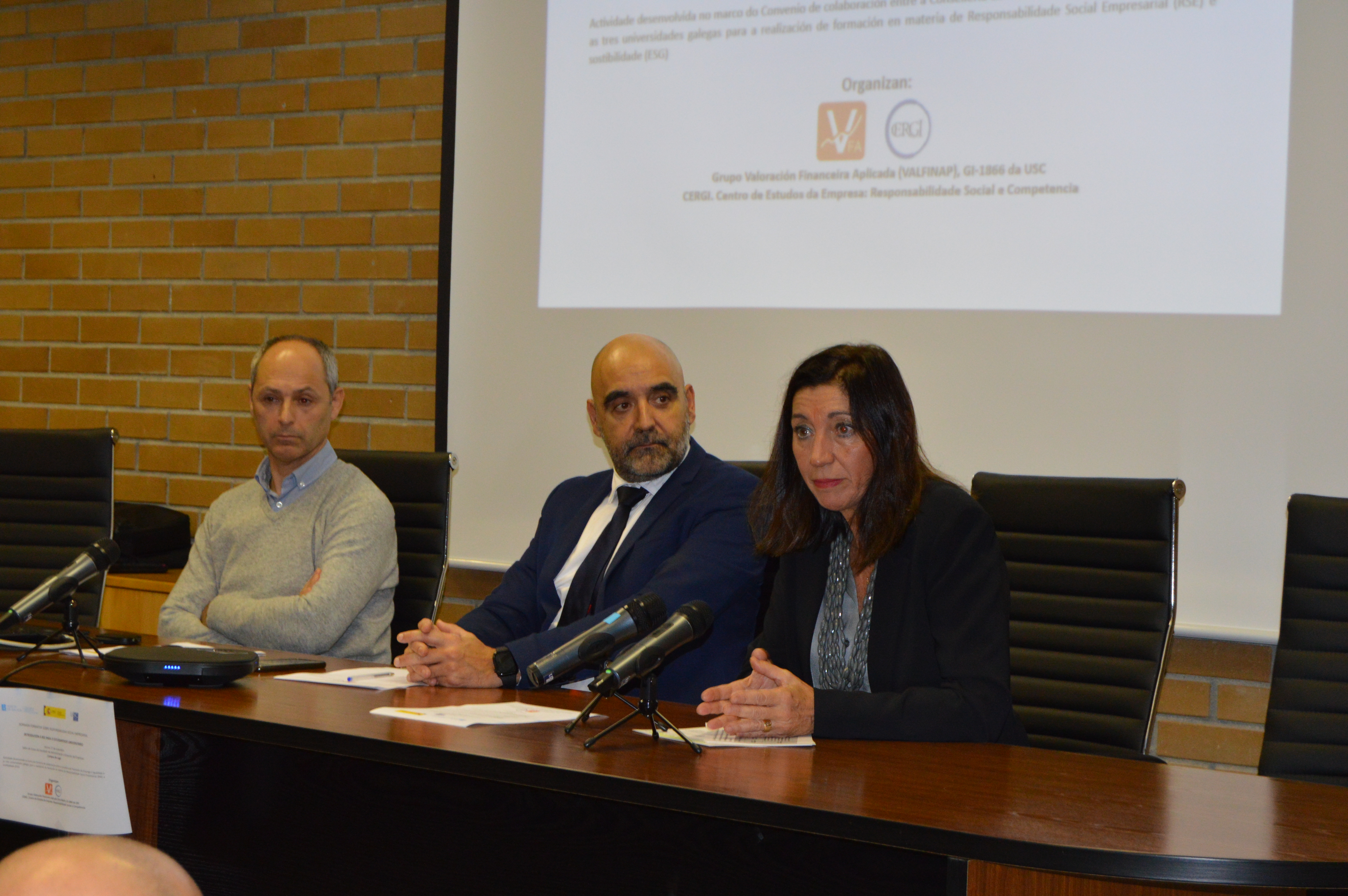 A responsabilidade social corporativa e/ou empresarial xera retorno e achega as empresas ás demandas ou inquedanzas de moitas persoas, asegurou este venres o decano da Facultade de Administración e Dirección de Empresas do Campus Terra da USC, Roberto Bande Ramudo, na apertura dunha xornada sobre responsabilidade social empresarial (RSE) promovidas pola Xunta de Galicia a través do Grupo Valoración Financeira Aplicada da USC, no marco dun acto no que participou a directora Xeral de Relacións Laborais da Xunta de Galicia, Elena Mancha, e o tamén profesor da USC na sede universitaria luguesa Ignacio Rodríguez.