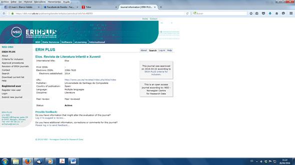A revista Elos. Revista de Literatura Infantil e Xuvenil acaba de ser incluída no índice ERIH Plus