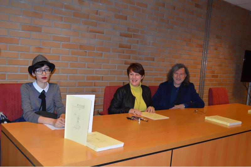 Ruth María González, María Isabel González Rey e Claudio Rodríguez Fer, na presentación do número 27 da revista Evohé