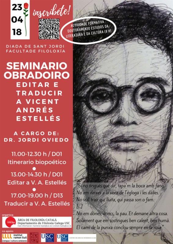 Co motivo da Diada de Sant Jordi, este luns 23 de abril a Área de Filoloxía Catalá da USC organiza o seminario práctico ‘Editar e Traductir a Vicent Andrés Estellés’. Dedicado a un dos poetas valencianos máis importantes da segunda metade do século XX para conmemorar o 25 aniversario da súa morte, o seminario impartirao Jordi Oviedo, especialista na súa obra e co editor dalgúns volumes da Nova Obra Completa que está a editar Edicions 3i4. Centrarase nos ámbitos da edición filolóxica e da tradución literaria do catalán ao galego, portugués e castelán principalmente.
