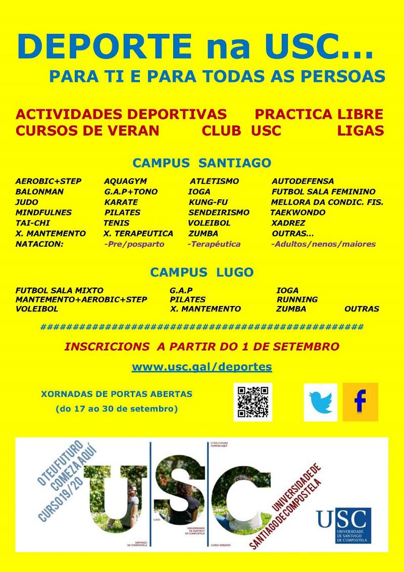 A oferta de actividades e escolas deportivas do Servizo de Deportes da USC para o curso 2019-2020 xa se pode consultar na web da USC, onde tamén se pode visualizar o calendario da programación xa deseñada, que podería ser susceptible dalgún tipo de variación en función da demanda rexistrada.