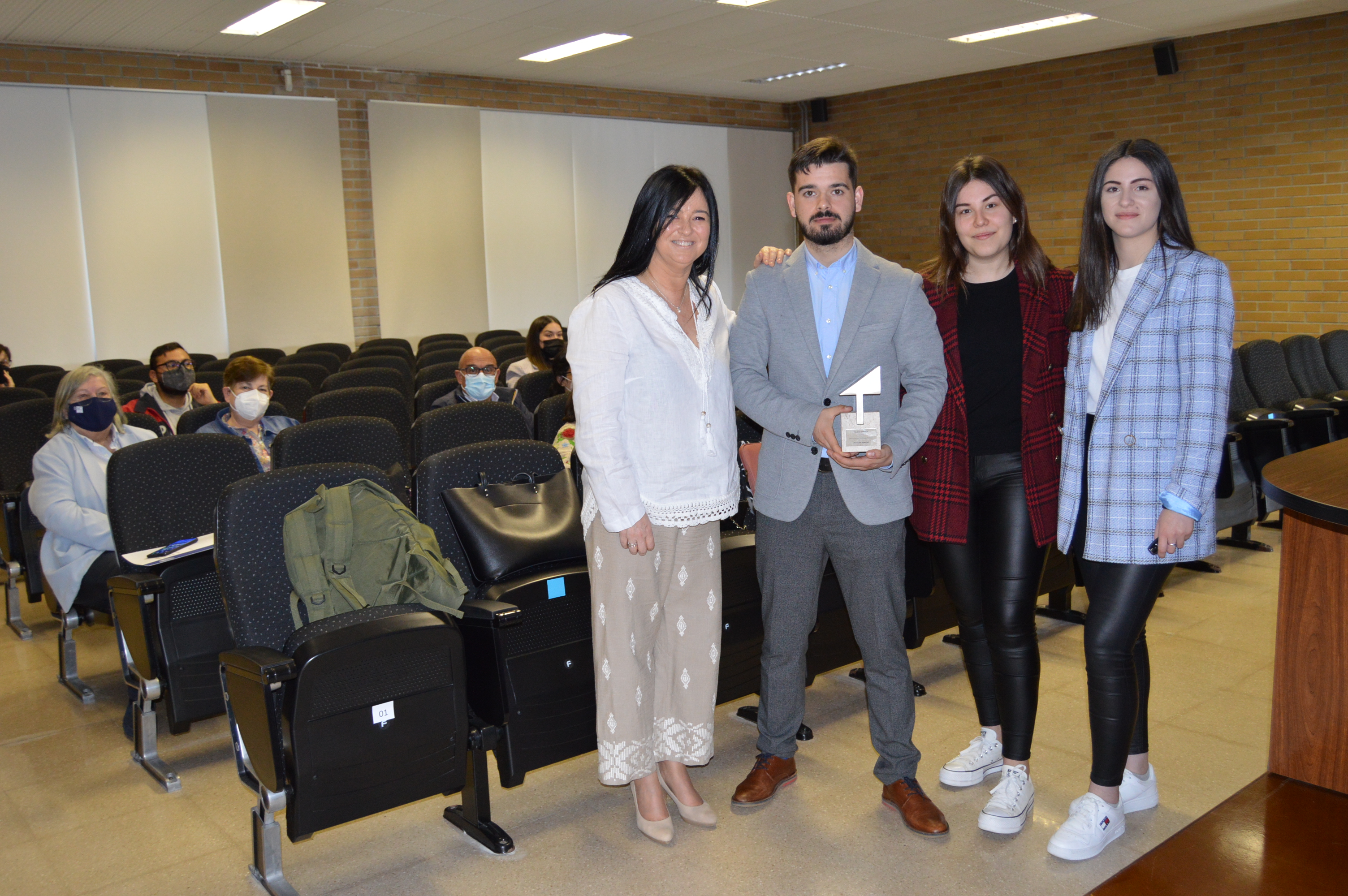 Os estudantes de cuarto curso do grao en Administración e Dirección de Empresas da USC Catherine Vales, Carla Fernández e Diego Rivas aproveitaron este acto de recoñecemento ofrecido polo centro no que están a completar o grao en Administración e Dirección de Empresas para achegar e explicar o proxecto Eurowheels a toda a comunidade universitaria.