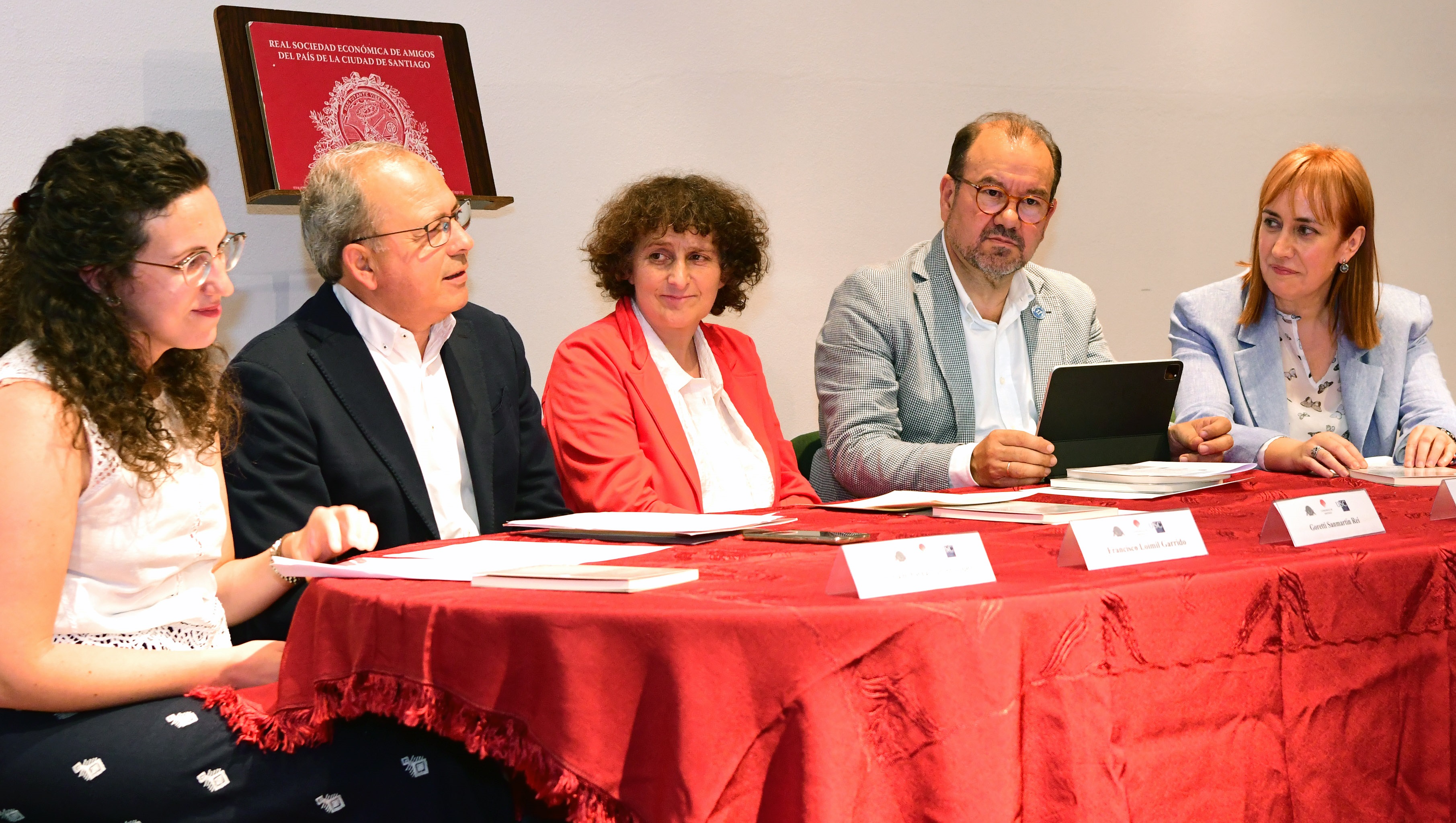 A profesora da USC na área de Historia da Arte, Miriam Elena Cortés López, presentou este xoves 13 a obra Socorrer enseñando: la Real Sociedad Económica y la literatura artística en Compostela, editada pola USC e polo Consorcio de Santiago. O volume recibiu en 2022 o premio Domingo Fontán de investigación histórica. O acto que se desenvolveu na Real Sociedade Económica de Amigos do País de Santiago, contou coa participación do reitor da USC, Antonio López; da alcaldesa do Concello de Santiago de Compostela, Goretti Sanmartín; da xerente do Consorcio, Belén Hernández; e de Francisco Loimil, presidente da Real Sociedade Económica, que acompañaron á autora na sesión de presentación.